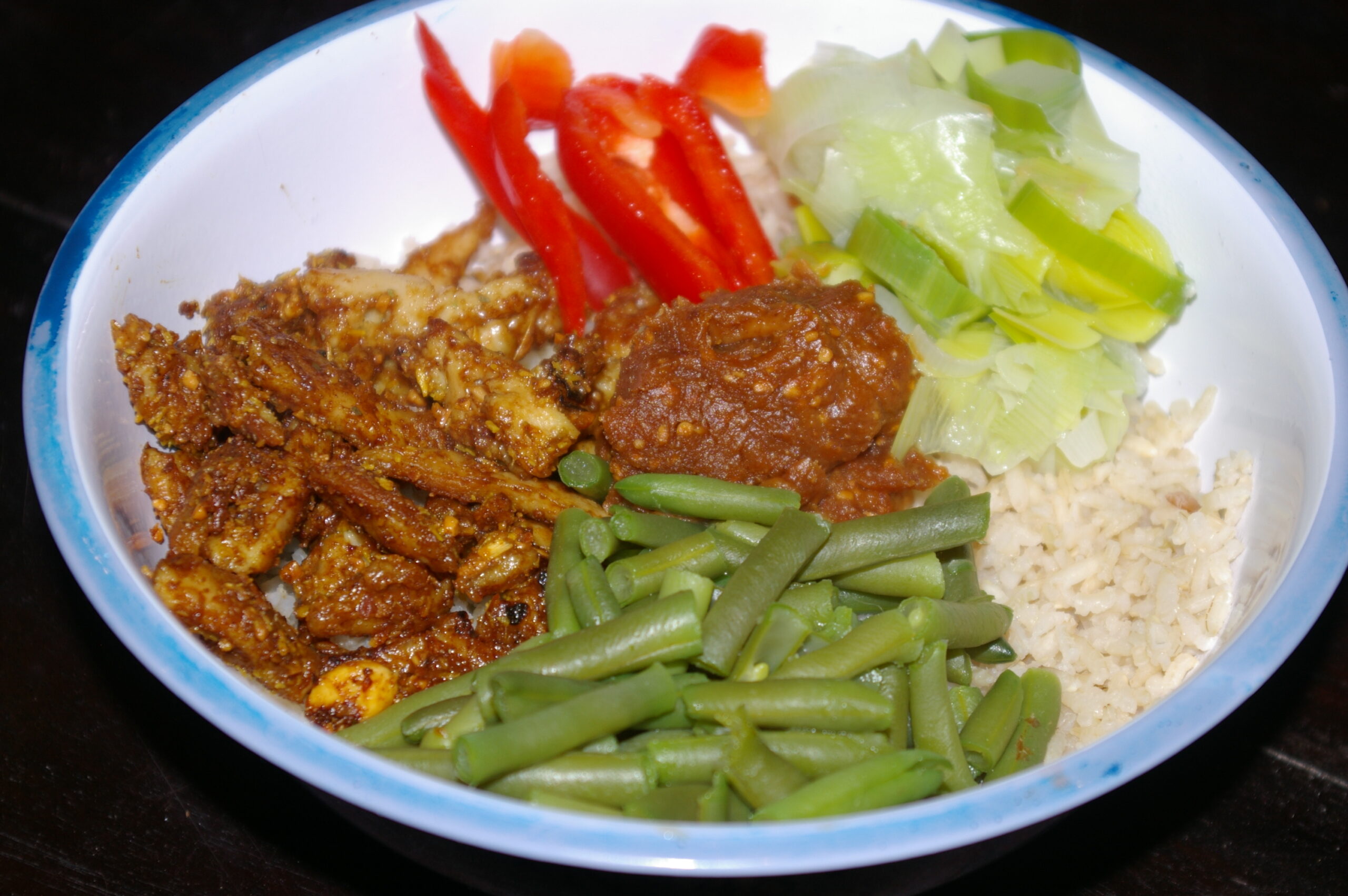 Vul de schaaltjes als volgt; onderop de zilvervliesrijst, ½ eetlepel pindakaas mengsel in het midden, ¼ deel van de paprika’s op de rijst, ¼ kipstuckjes op de rijst, ¼ deel prei op de rijst, ¼ deel sperziebonen op de rijst en hier bovenop een gebakken ei.