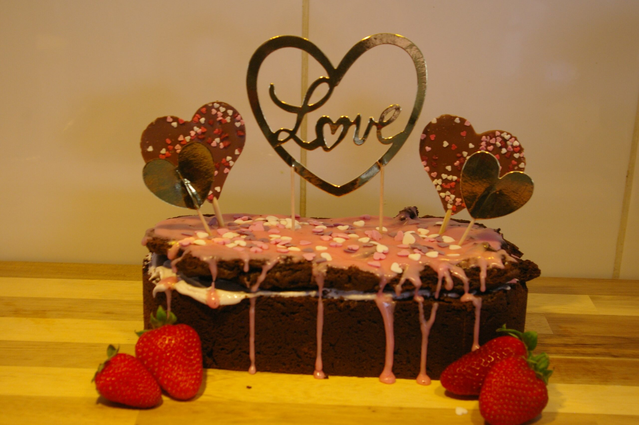 Steek de hartjes lolly’s en topper in de brownie en versier de brownie af met de suikerhartjes.