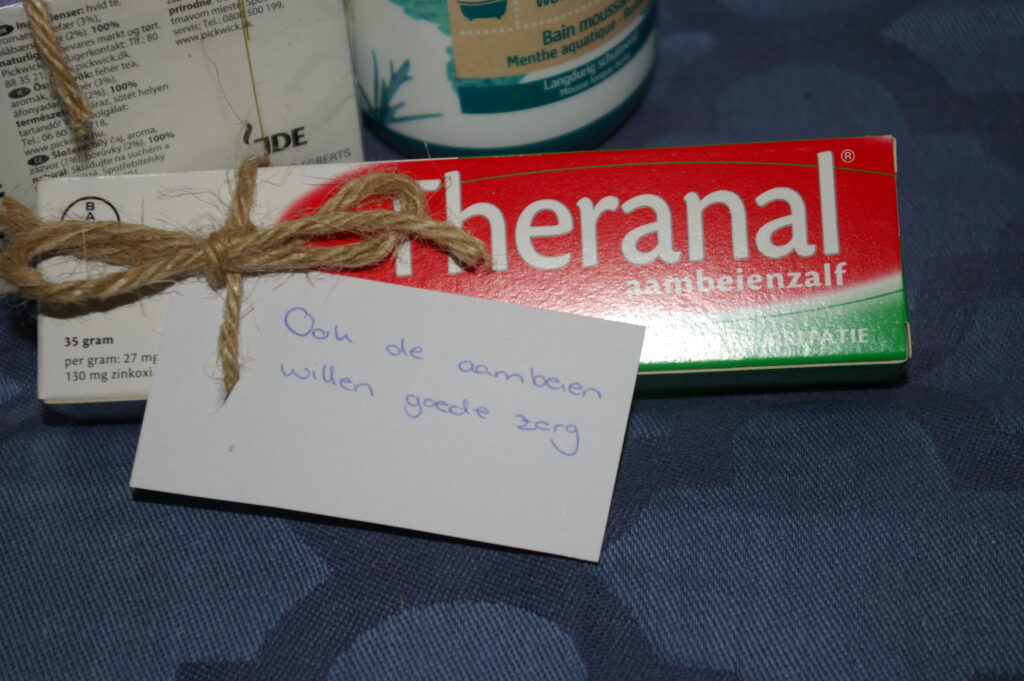 Ze krijgt een variant op de blije doos, namelijk de gescheurde doos. Een doos met lekkere badschuim, chocolade, maar ook aambeien crème. Dit zijn hele dierbare vrienden, anders had ik dit nooit durven geven.