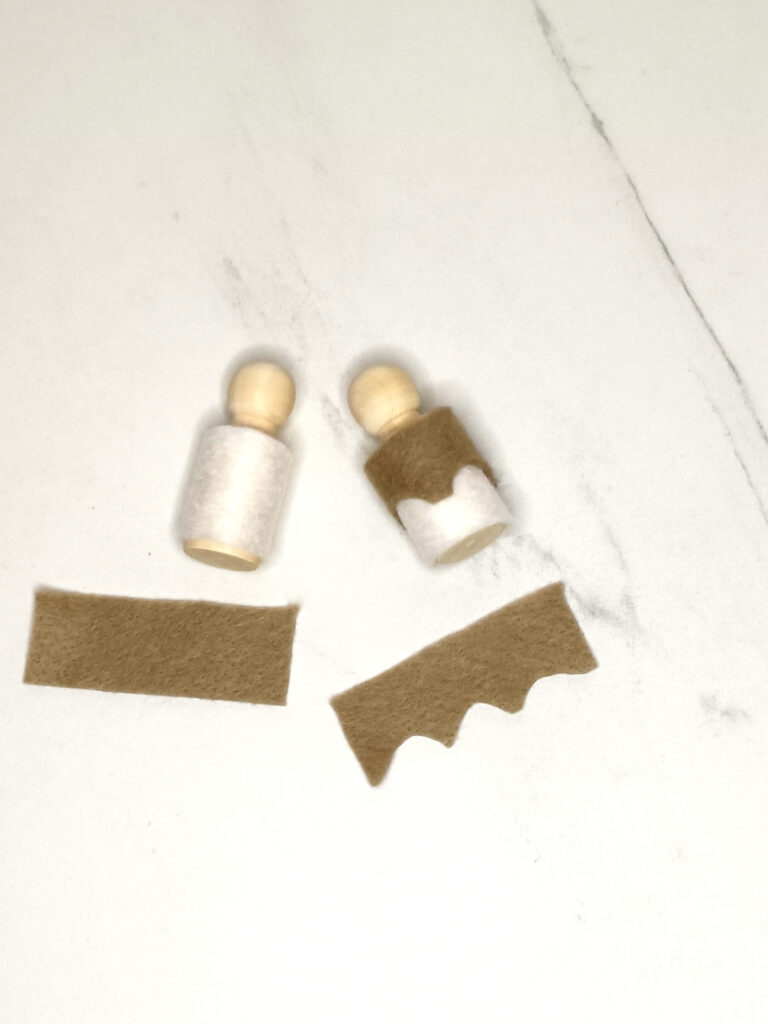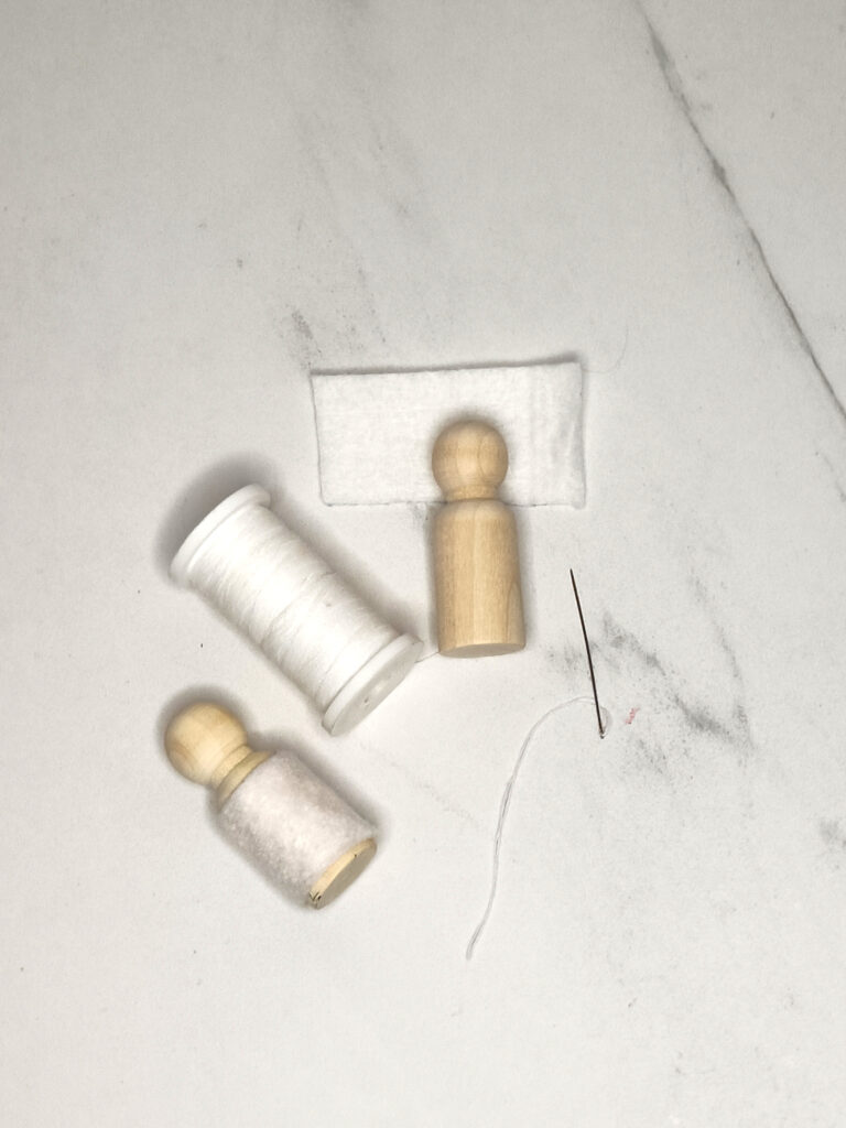 Knip uit het witte vilt het lijfje van de peg doll. De afmetingen voor het lijfje is 6.6*3.5 cm. Naai de het lijfje aan de achterkant dicht.