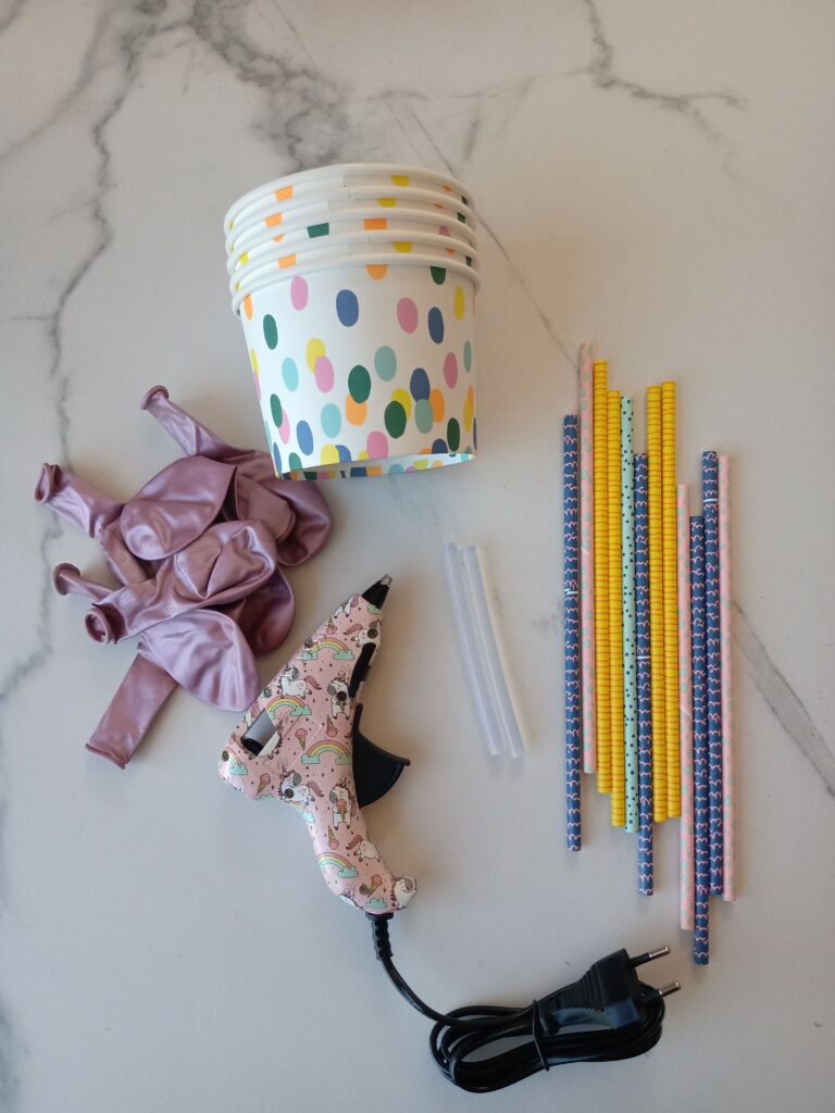 Warm het lijmpistool op. Lijm met het lijmpistol op de bovenzijde van het rietje lijm. Plak de rietjes vast aan de ballon.