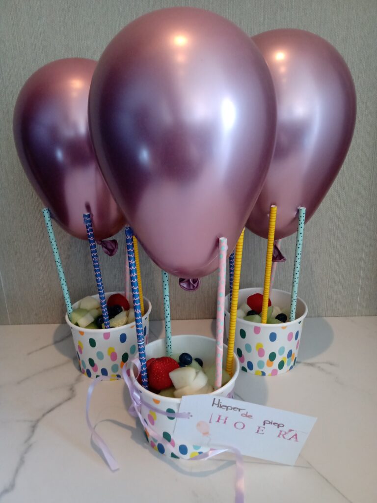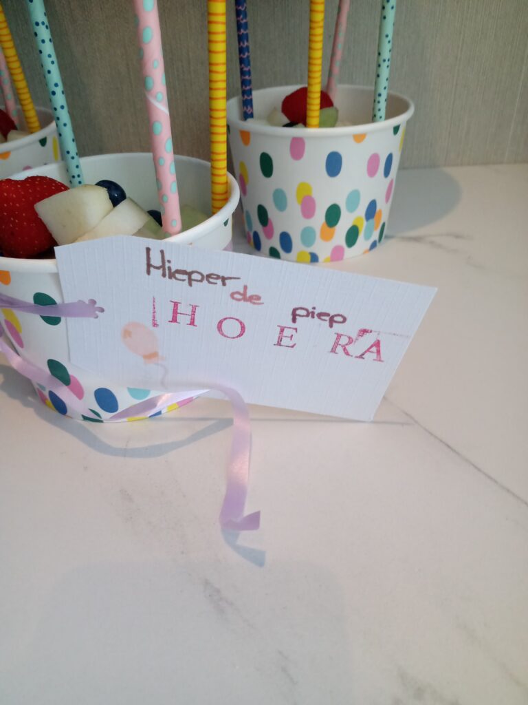 Je kan de bakjes helemaal naar wens vullen. Voor het voorbeeld heb ik de bakjes gevuld met fruit, maar dat kan ook met popcorn of snoep.