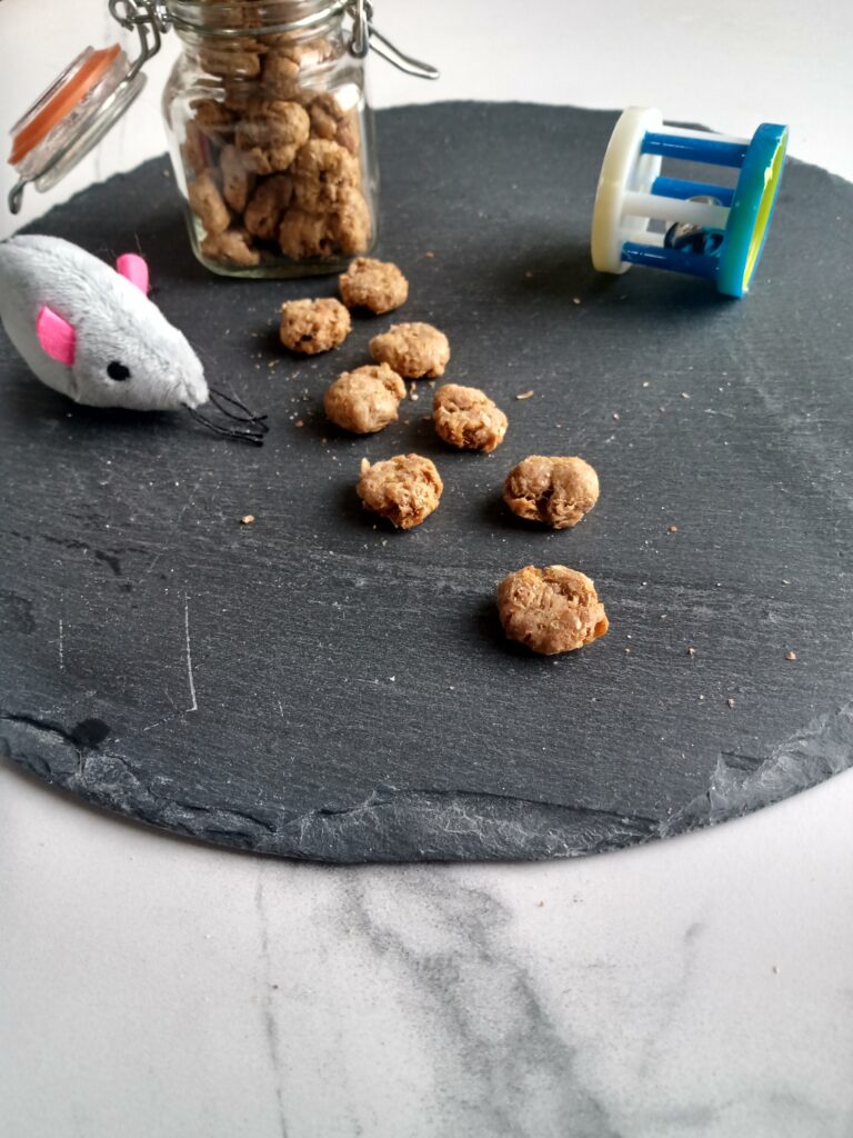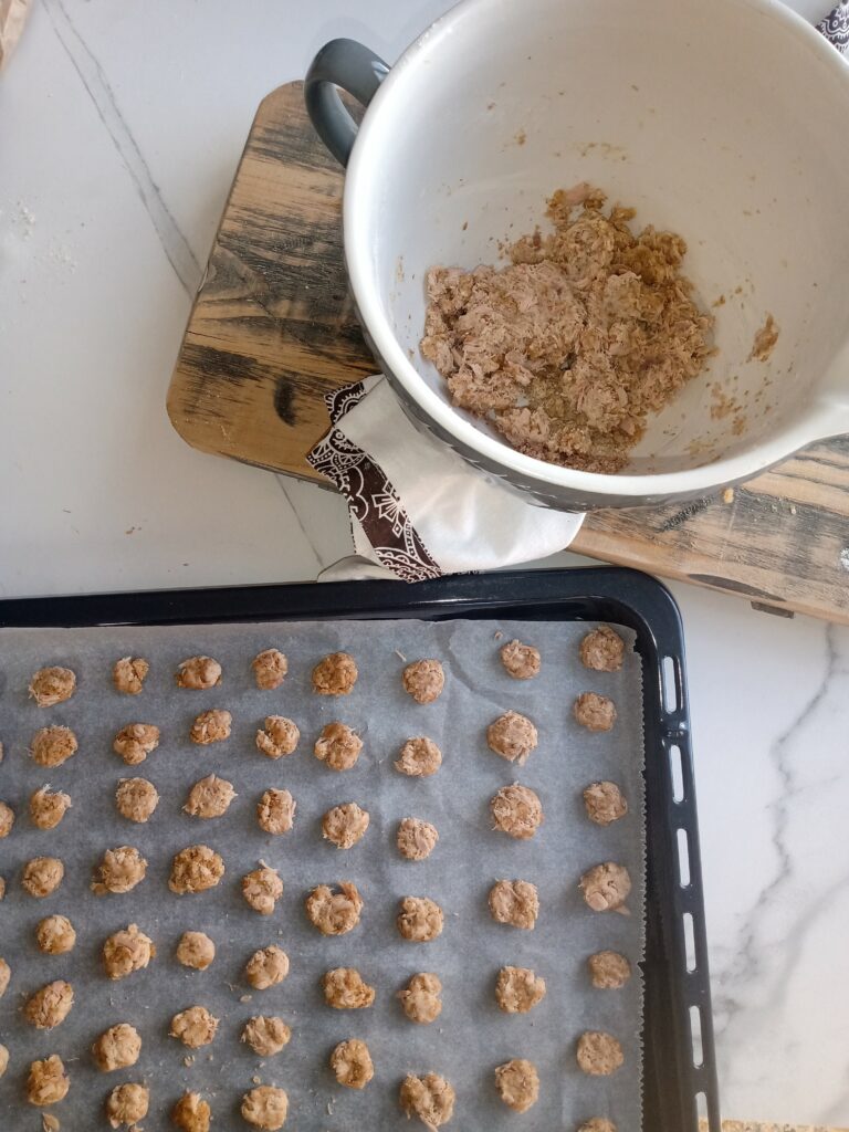 Tip: Is jouw kat een typische schranser. Je kunt met een vork het snoepje een klein beetje inprikken dan kun na het bakken het snoepje makkelijker breken.