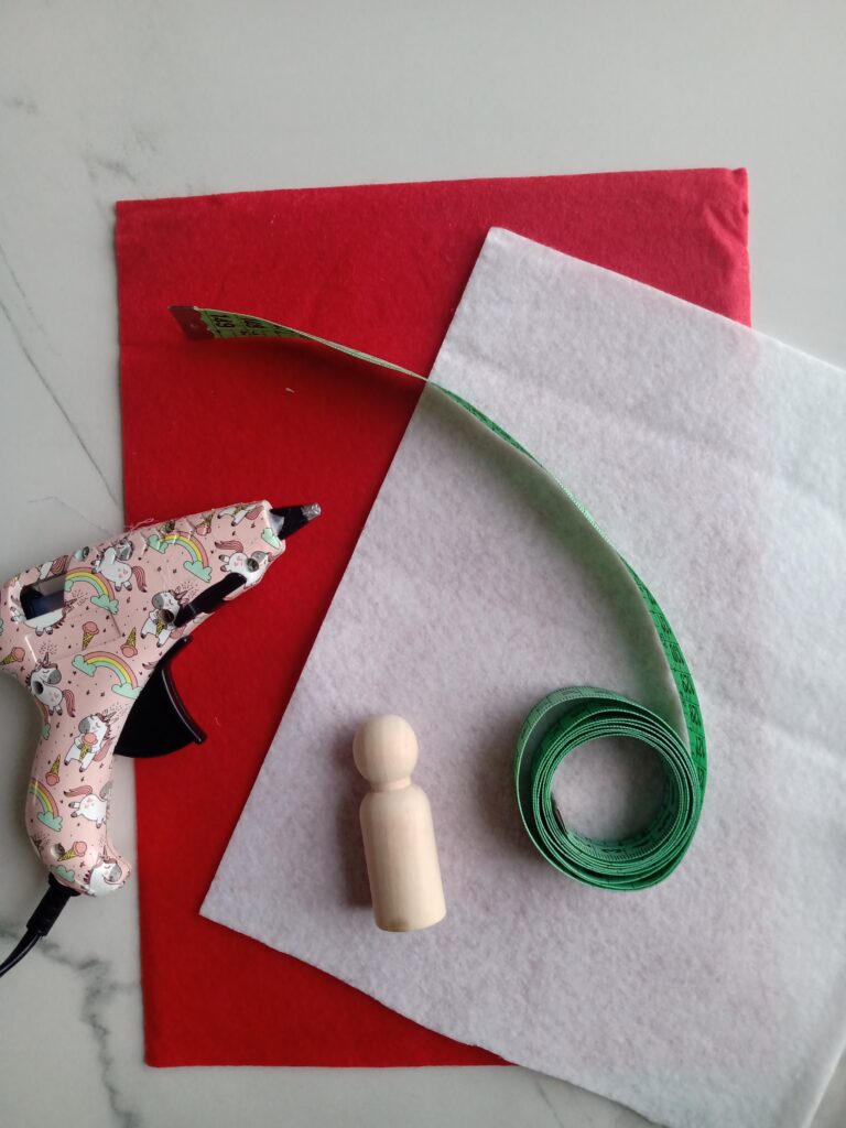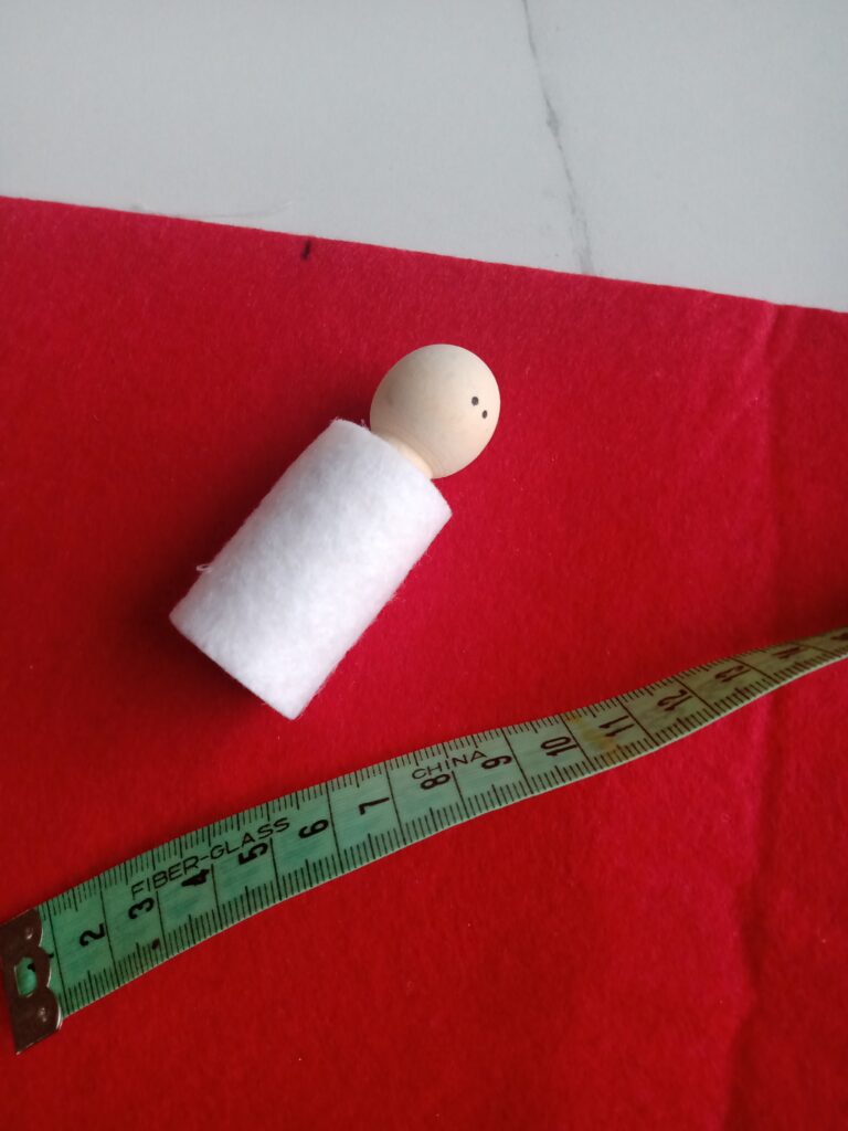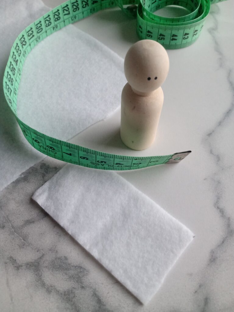 Meet de lengte en de omtrek van de romp van de peg doll. Teken de afmeting af op het witte vilt en knip dit uit.