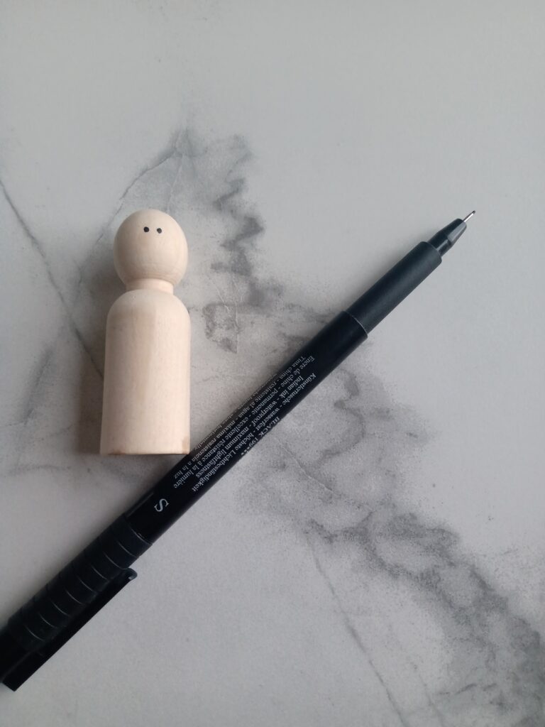 Teken met de finelijner twee stippen op het gezicht van de peg doll.