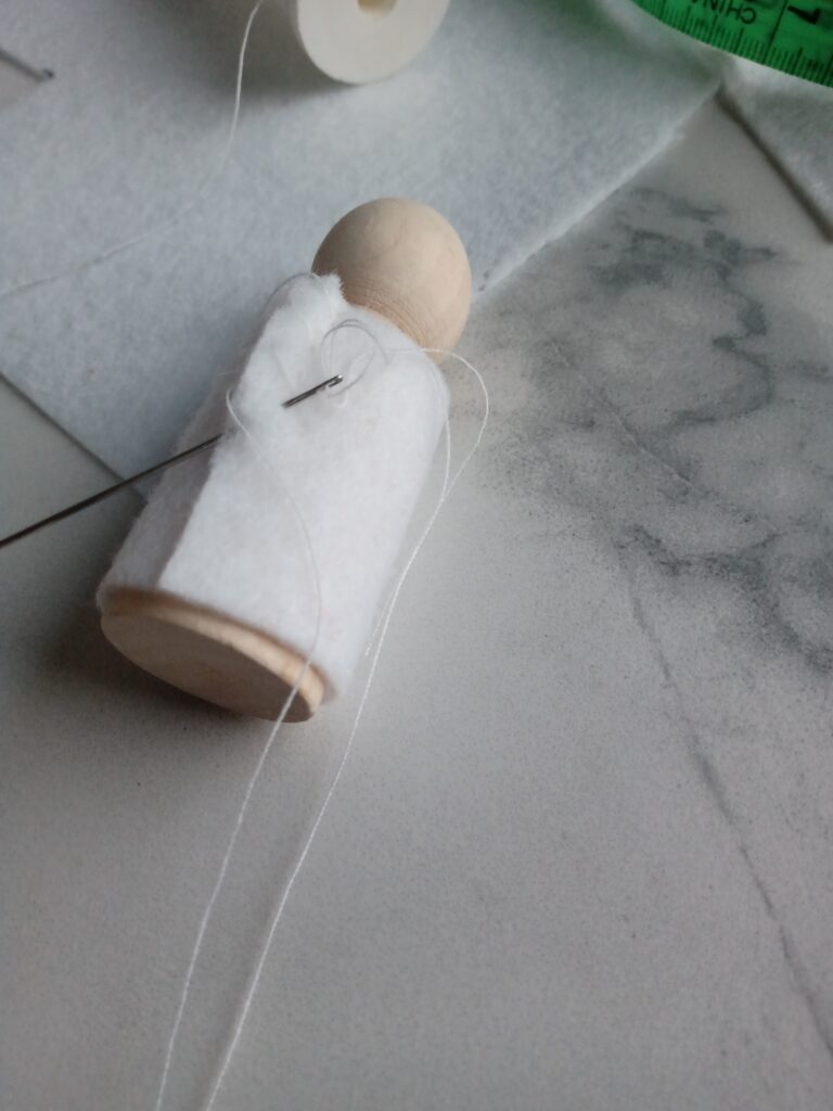 Naai het stuk witte vilt aan de achterkant vast van de peg doll.