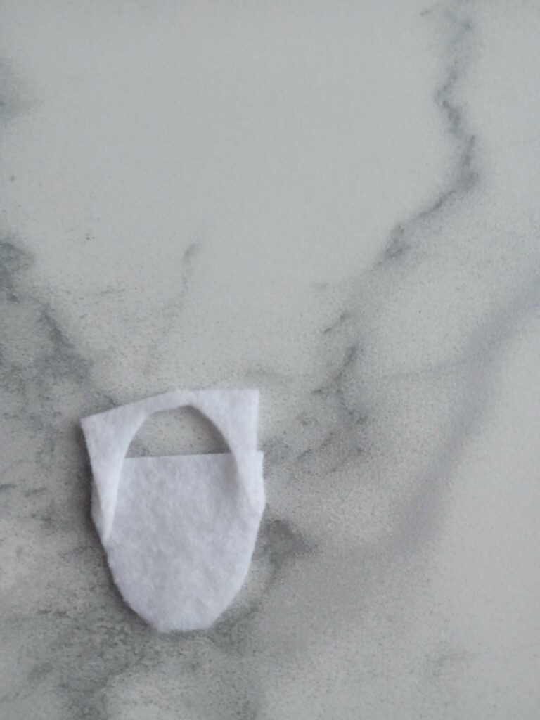 Vouw het witte stuk dubbel en knip een ronde punt uit voor de baard. Knip van het rest stukje een snor.