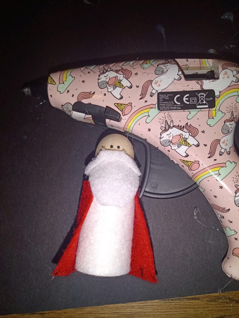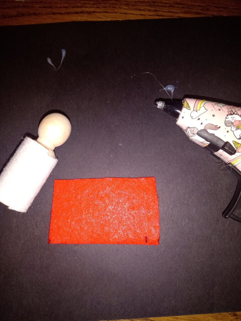 Verwarm de lijmpistol. Lijm de tabberd van de Sint vast aan de romp van de peg doll.