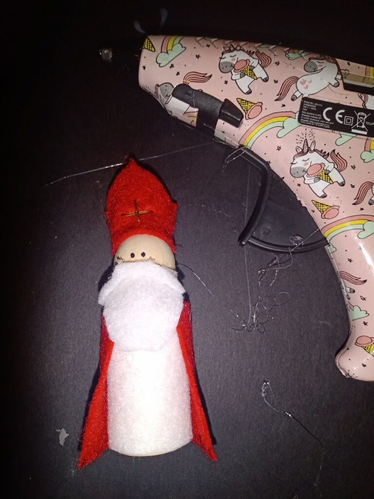 Lijm met het lijmpistol de mijter vast op de hoofd van de Sint.