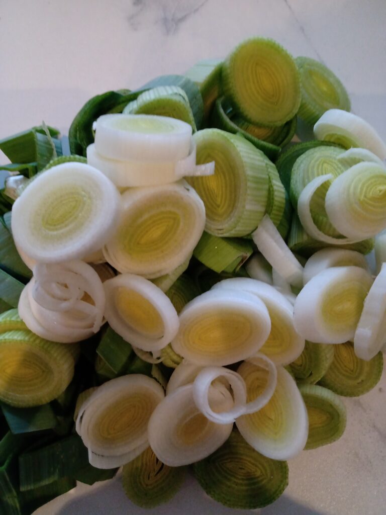 Snij de prei in dunne ringen. Was de preiringen toe aan de soep en laat de soep nog 8 minuten zachtjes doorkoken.
