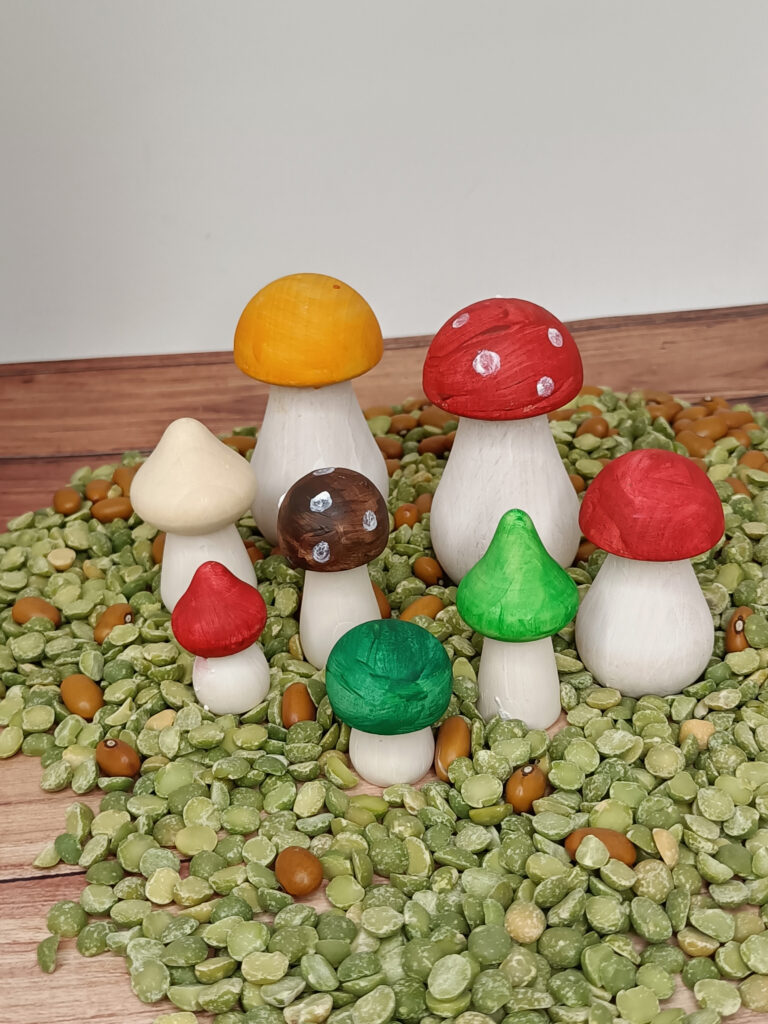 Het schilderen van houten paddenstoelen voor boeiend sensorisch spel