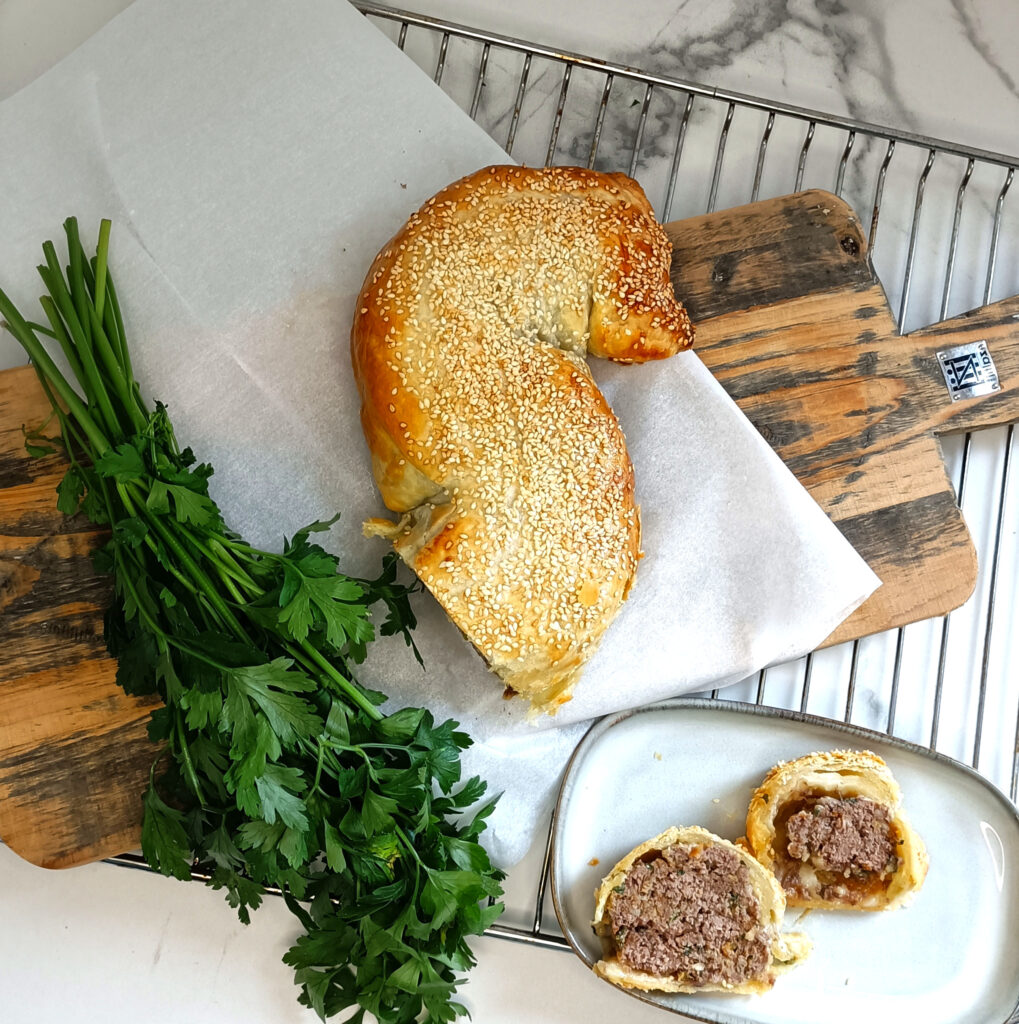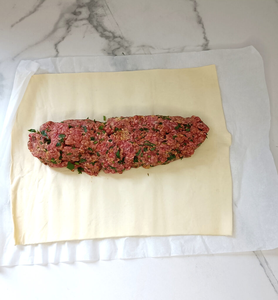 Rol de bladerdeeg uit en verdeel het gehakt in de lengte over de rol. Zorg dat je 3 cm van de rand leeg houdt. Rol de rol op en druk de zijkanten dicht met de vork.