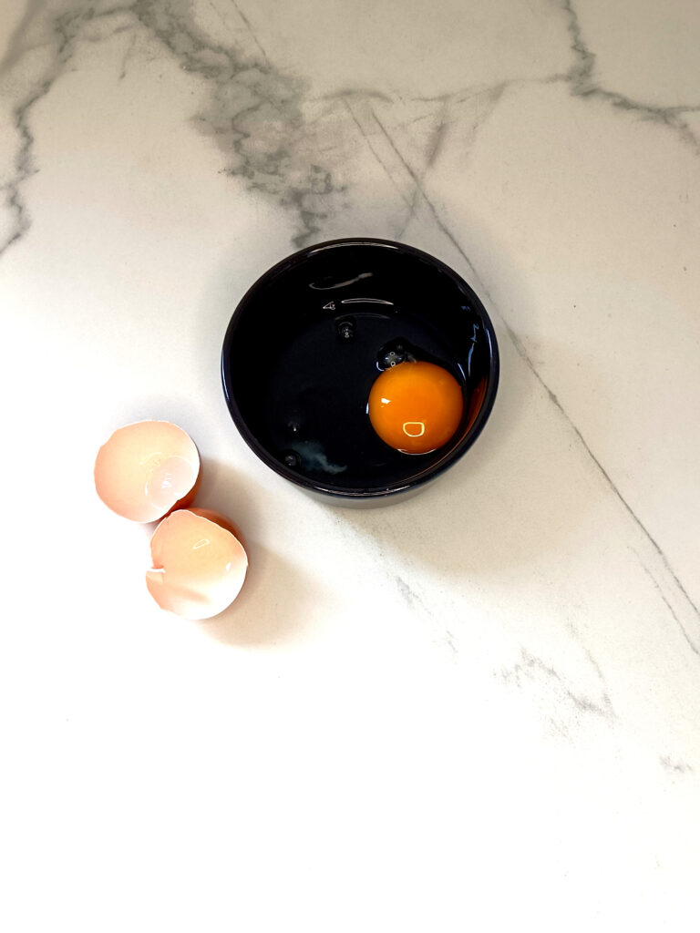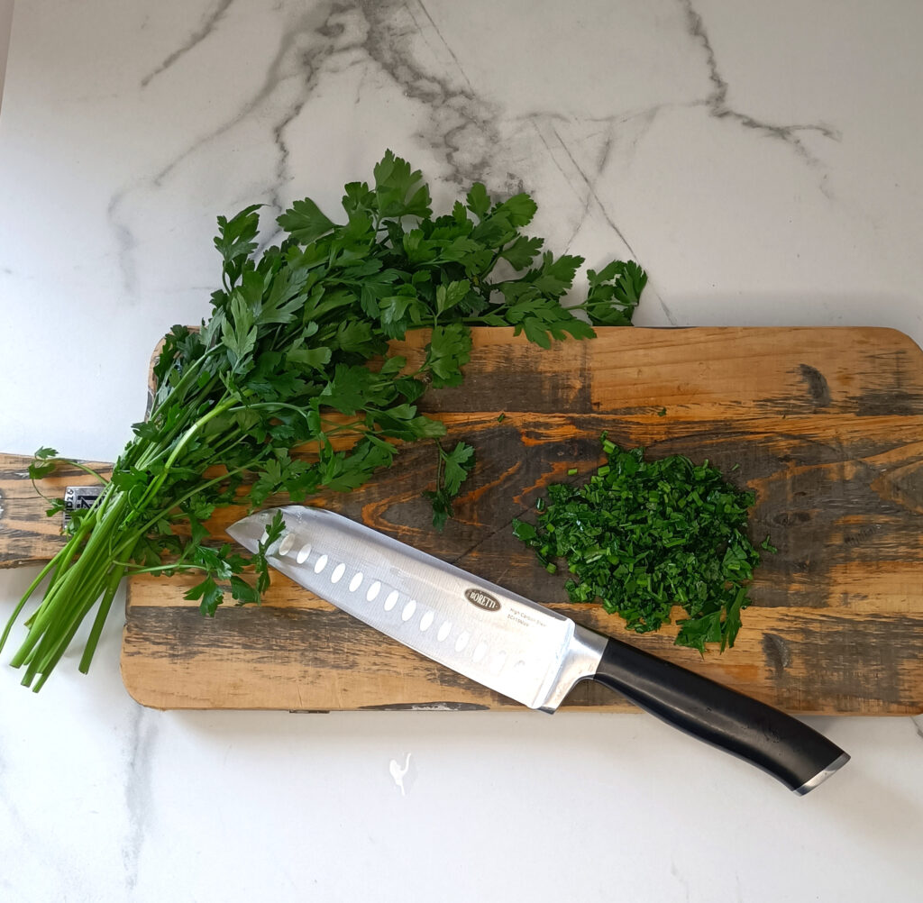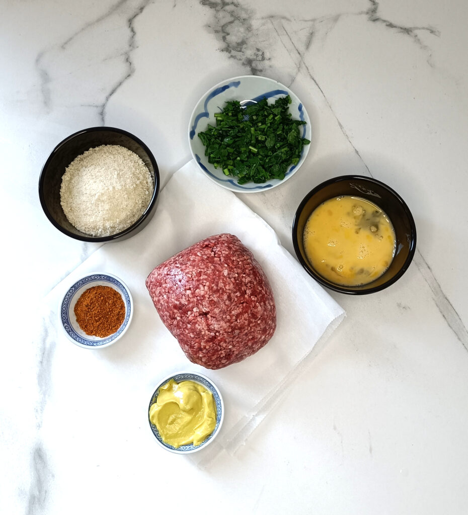 Meng het gehakt, ⅔ van het geklutste ei, de panko, mosterd, peterselie en gehakte kruiden door elkaar.