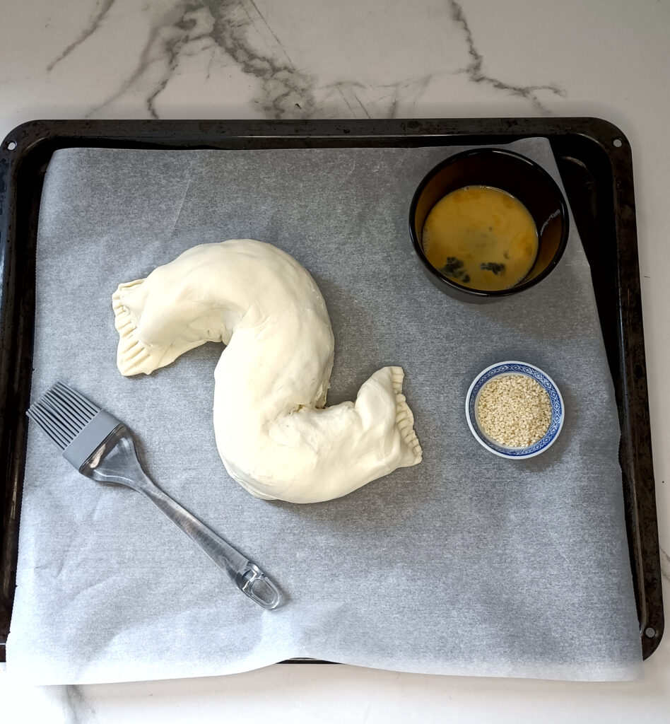 Leg het bakpapier op de bakplaat. Vorm de letter-s van de rol. Bestrijk de letter-s met het geklutste ei en bestrooi dit met de sesamzaad.