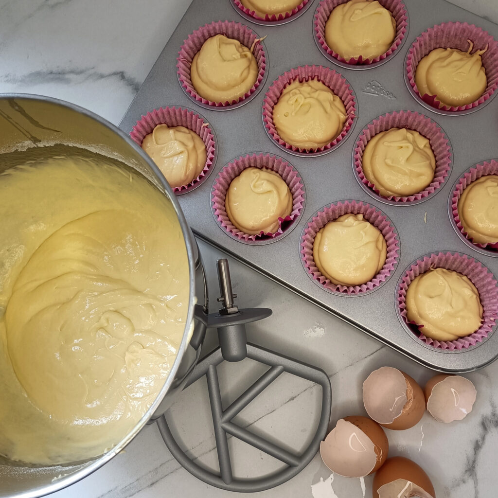 Verdeel het cupcake beslag gelijkmatig over de voorbereide cupcake vormpjes, vul ze tot ongeveer twee derde vol.