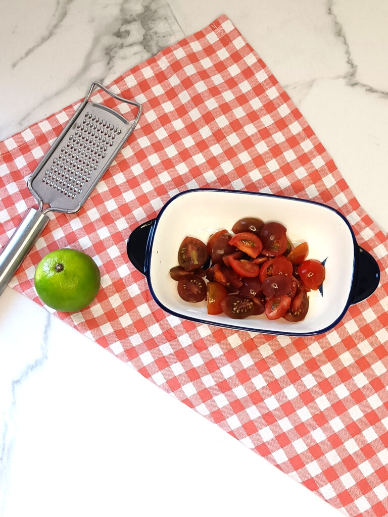 Snij de ui, rode paprika en tomaten in stukjes en bak dit 3 minuten in de pan. Pers de knoflook uit en raspt de schil van de limoen en bak dit nog 2 minuten mee.