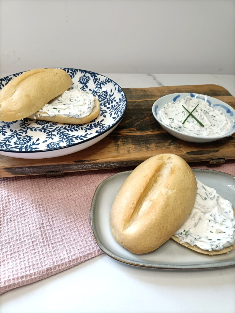 Snij het broodje open en smeer de roomkaas erop. De overgebleven roomkaas kun je 5 tot 7 dagen in de koelkast bewaren.