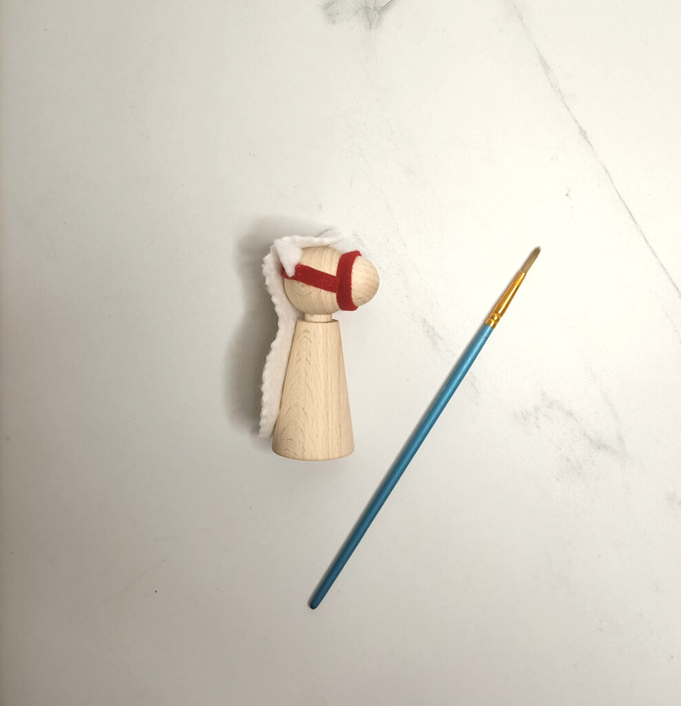 Plak met de houtlijm de halve bol vast aan het gezicht van de peg doll.