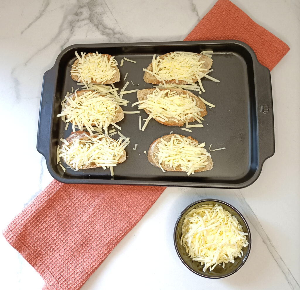 Verwarm de oven 230 graden. Snijd het stokbrood in plakjes en strooi er plantaardige kaas overheen. Bak de plakjes stokbrood 5 minuten op 230 graden voor een heerlijk knapperige topping.