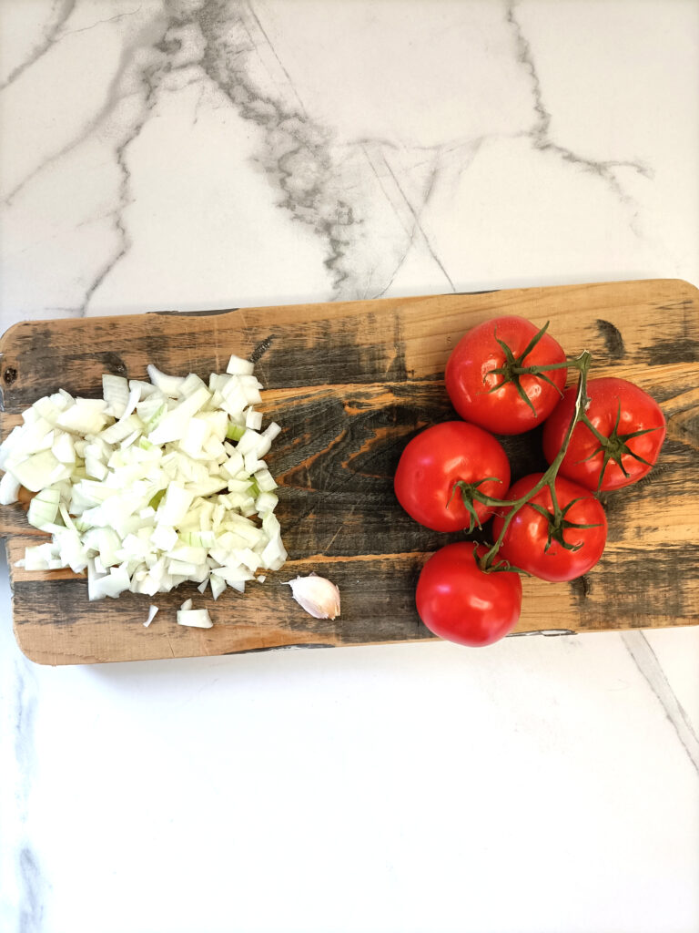 Snipper de ui, hak de knoflook fijn en snijd de tomaat in blokjes.