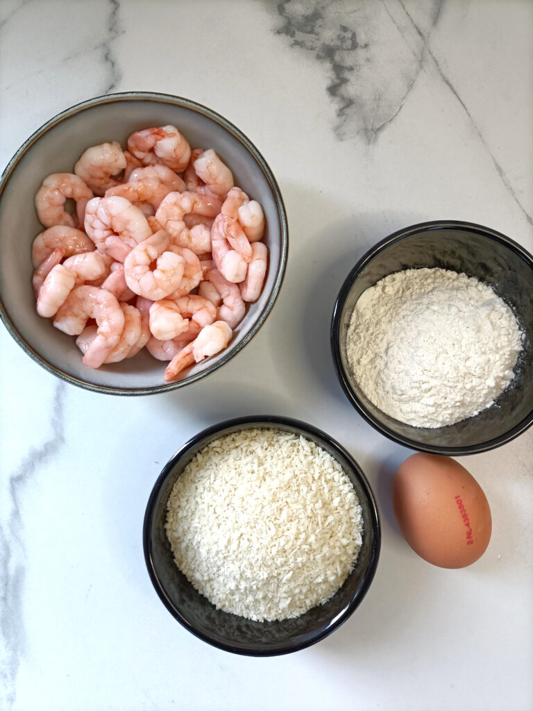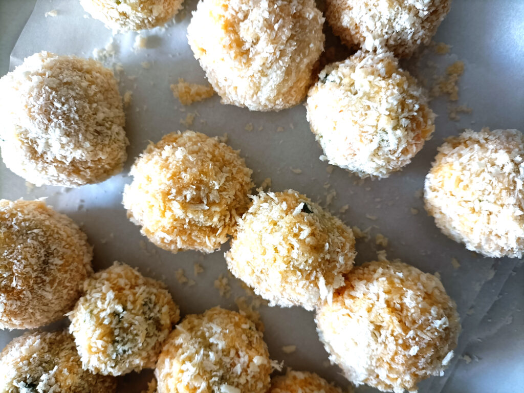 Klop het ei los. Maak twee schaaltjes; een met panko en de ander met het losgeklopte ei. Maak kleine balletjes van het afgekoelde garnalen mengsel.Rol de garnalenballetjes eerst door losgeklopt ei en daarna door paneermeel.