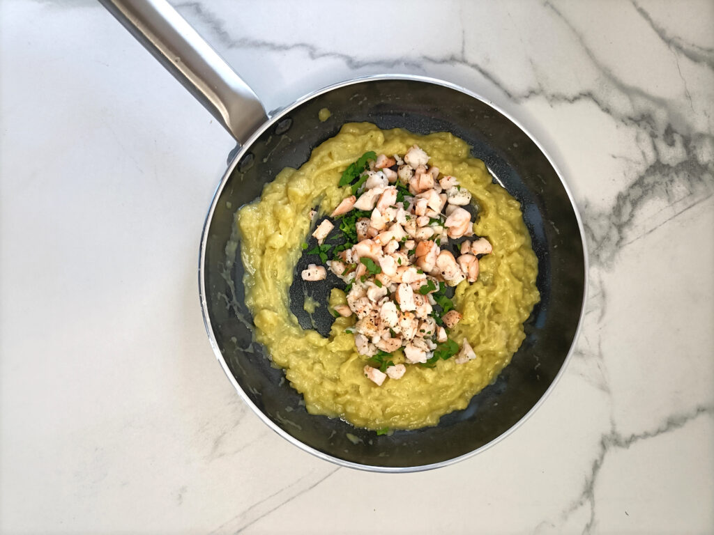 Voeg de gepelde garnalen, bieslook en peterselie toe aan de saus en roer goed door. Laat het mengsel ongeveer 5 minuten sudderen tot de garnalen gaar zijn.