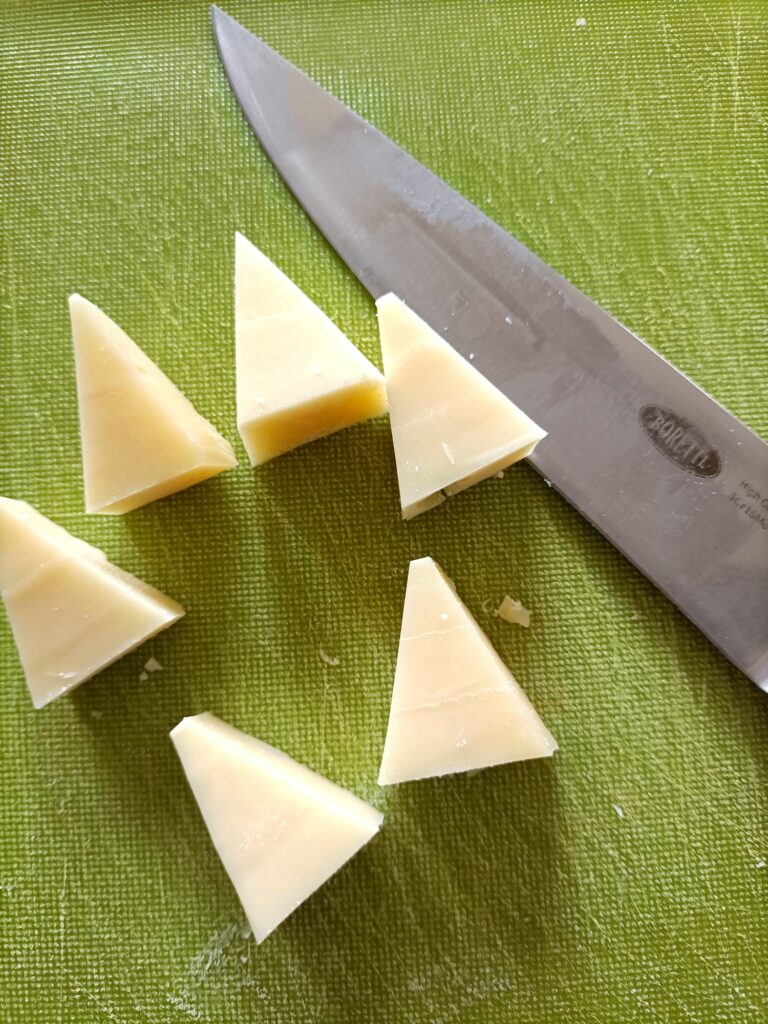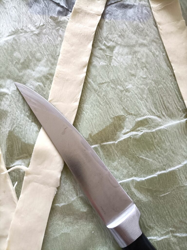 Halveer de rol bladerdeeg. Snij uit de bladerdeeg 10 stroken.