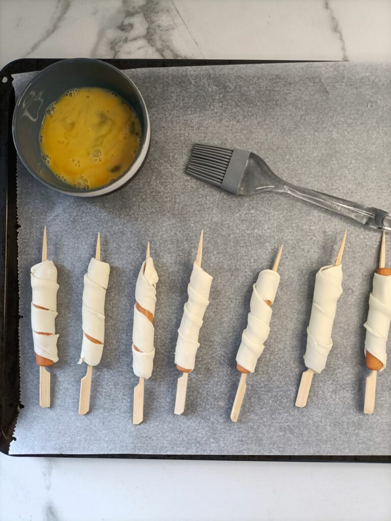 Kluts het ei. Smeer de knakworsten in met het ei. Bak de vuurpijlen af 20 minuten op 180 °c. Laat de vuurpijlen na het bakken 5 minuten afkoelen.