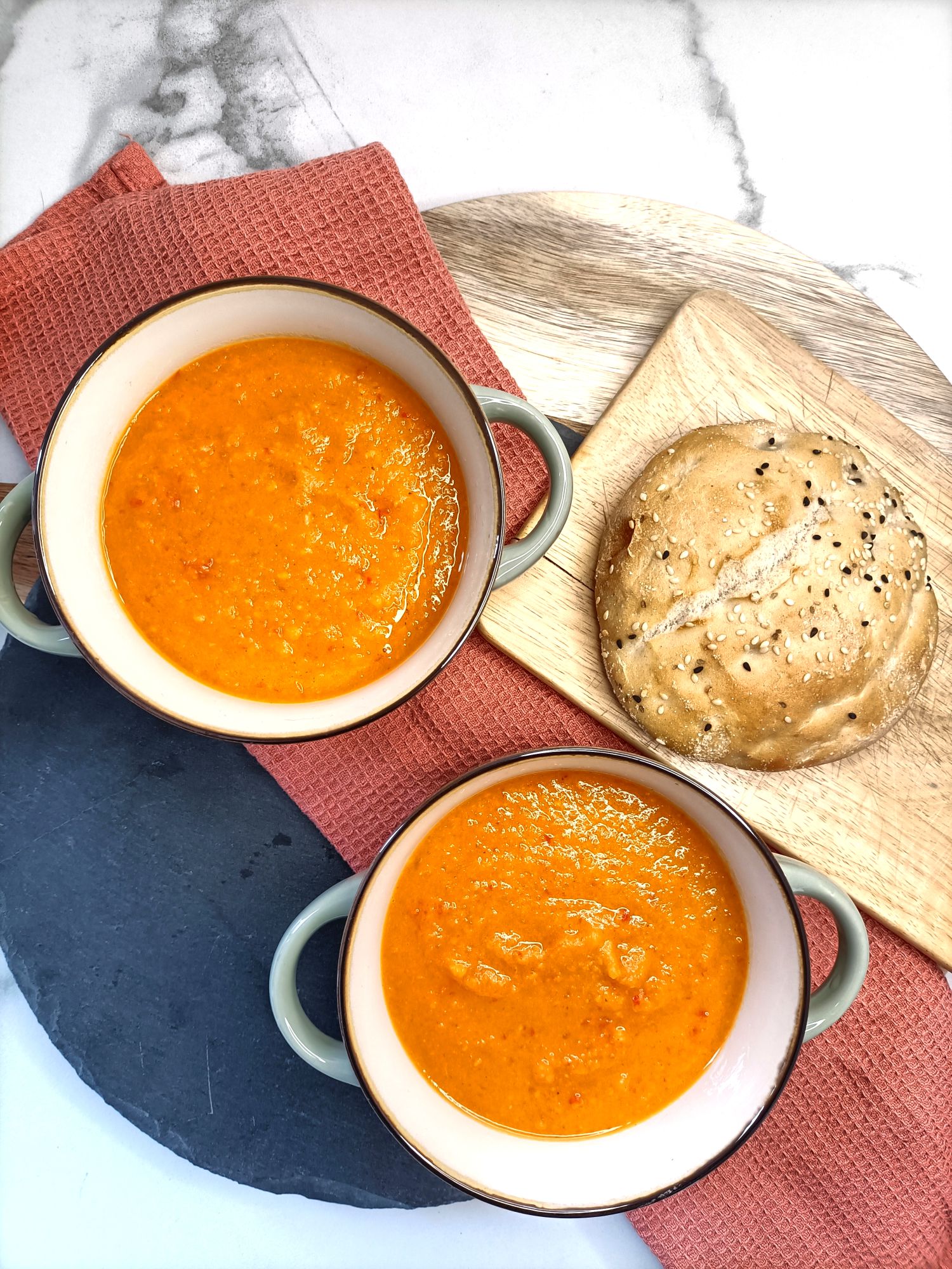 Mix de soep glad en voeg naar smaak de cayennepeper toe.