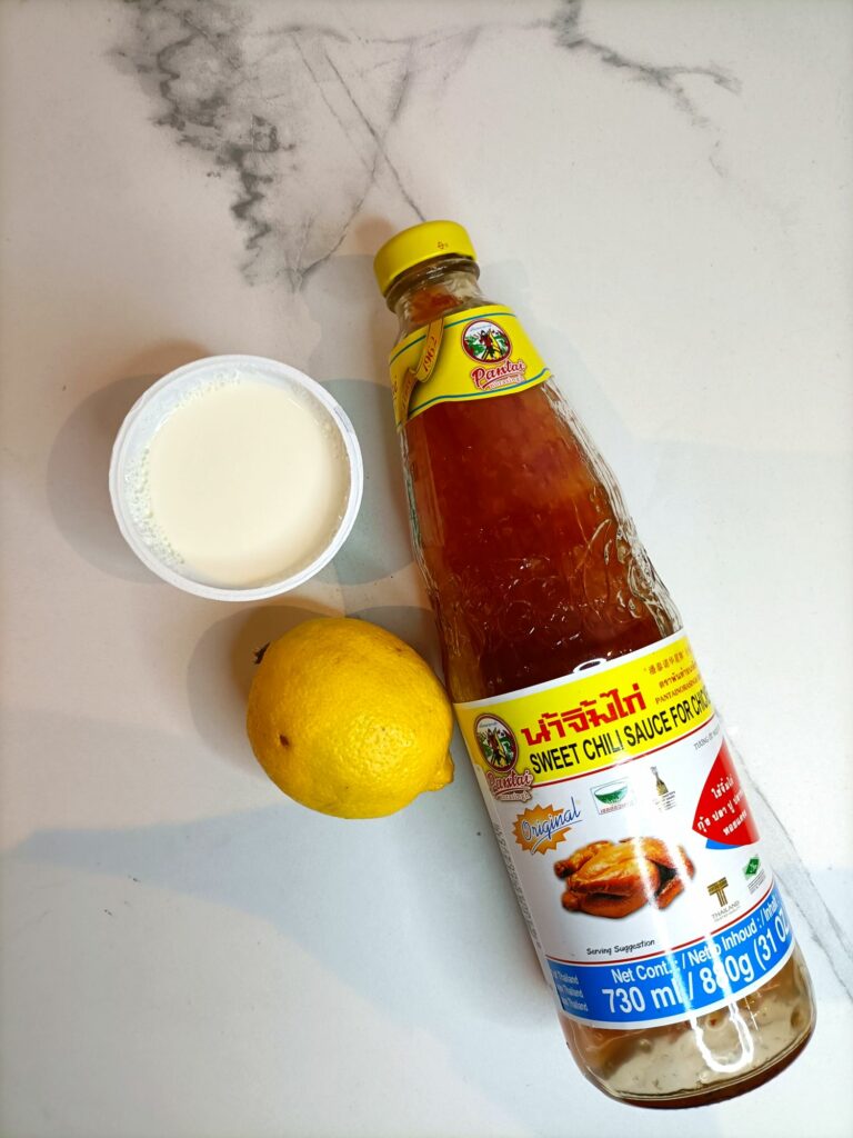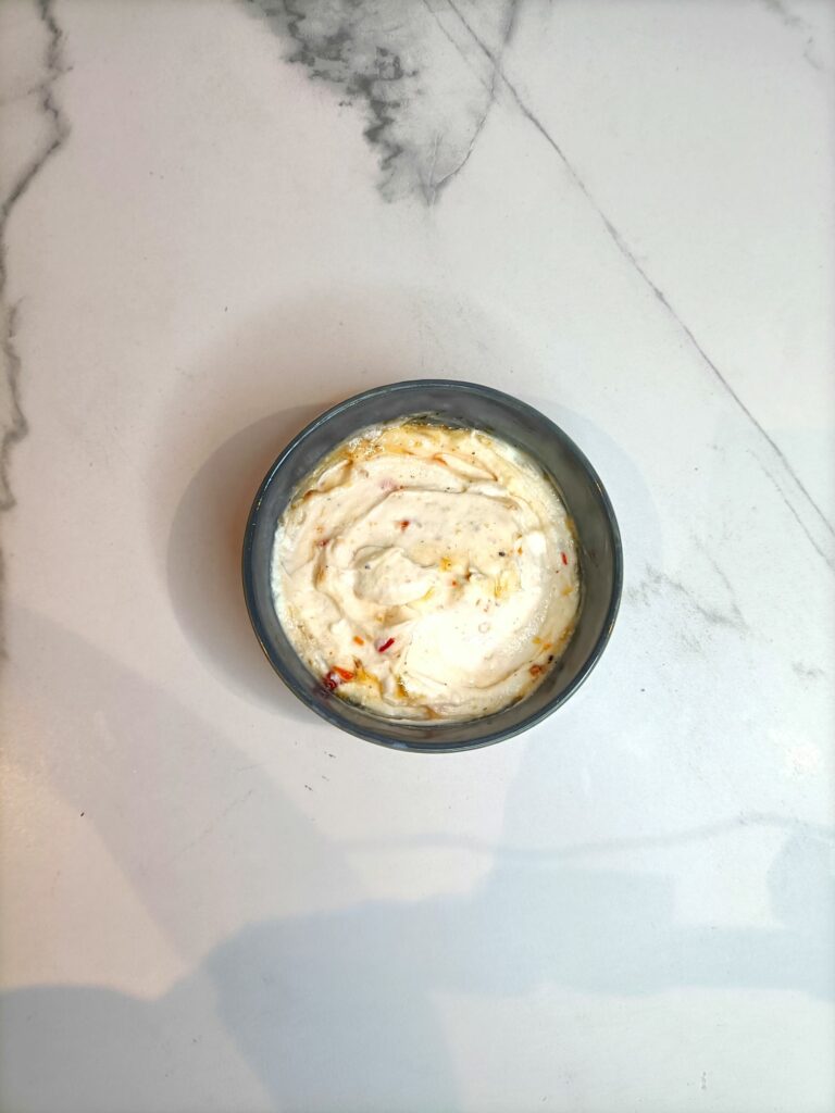 Voeg de crème fraîche, chilisaus en citroensap in een schaaltje en meng alles door elkaar. Voeg naar smaak peper en zout toe