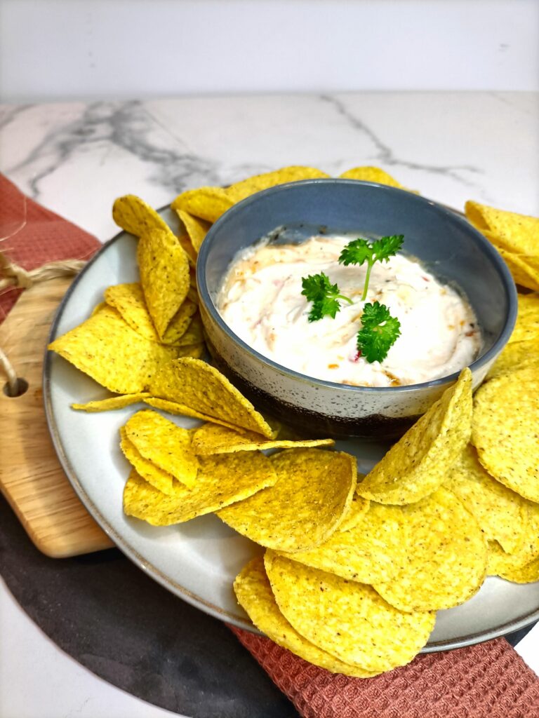 Zet het schaaltje met de Gooische dip op een bord en leg rondom het schaaltje nacho chips.