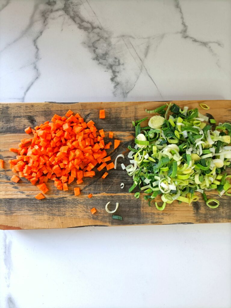 Maak de prei en wortels schoon en snij deze in kleine stukjes. Voeg de groenten toe.