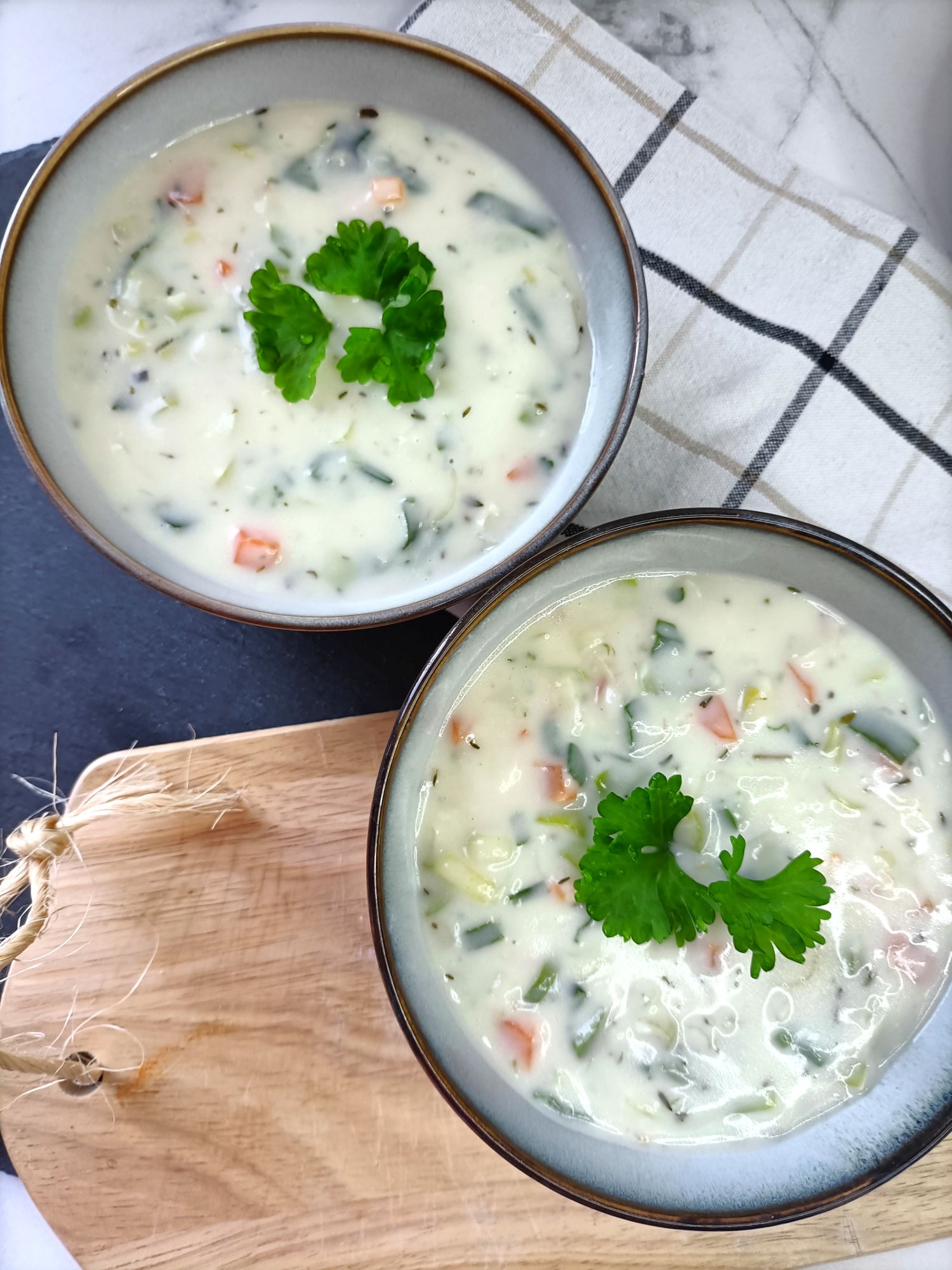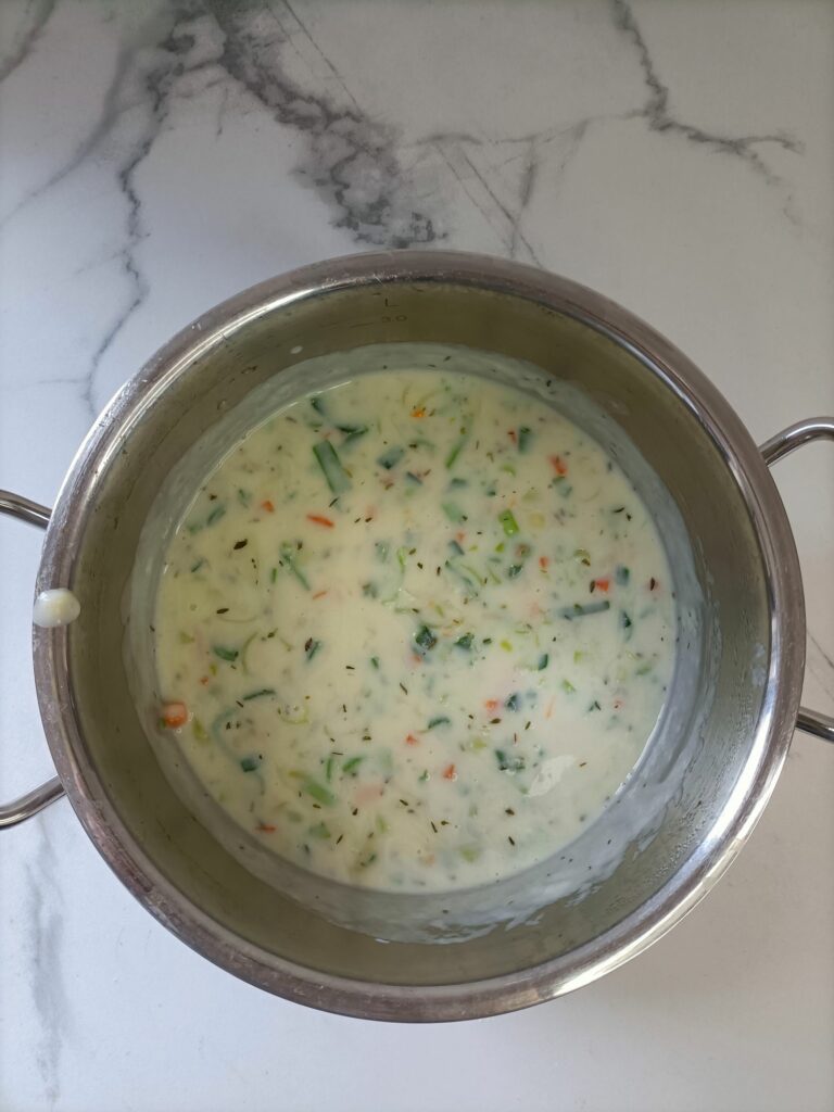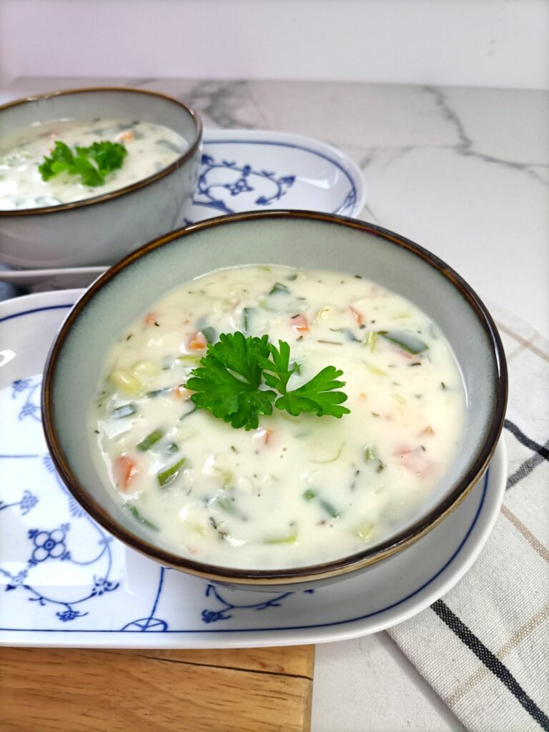 Romige koninginnensoep met verse groenten