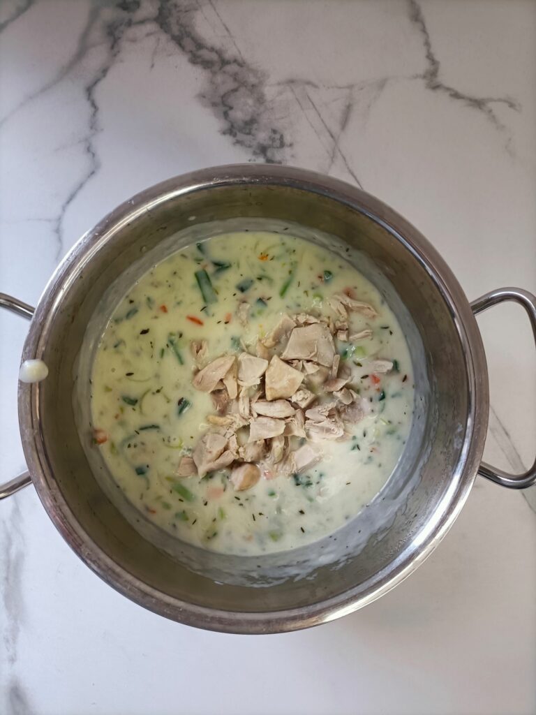 Voeg tot slot het gekookte kippenvlees toe aan de soep en warm nog even door.
