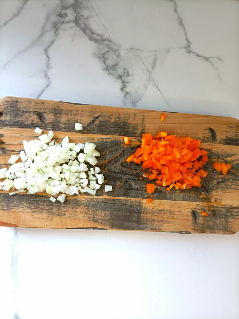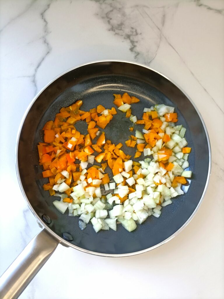 Verhit de olie in de pan en bak de knoflook, ui en paprika glazig.