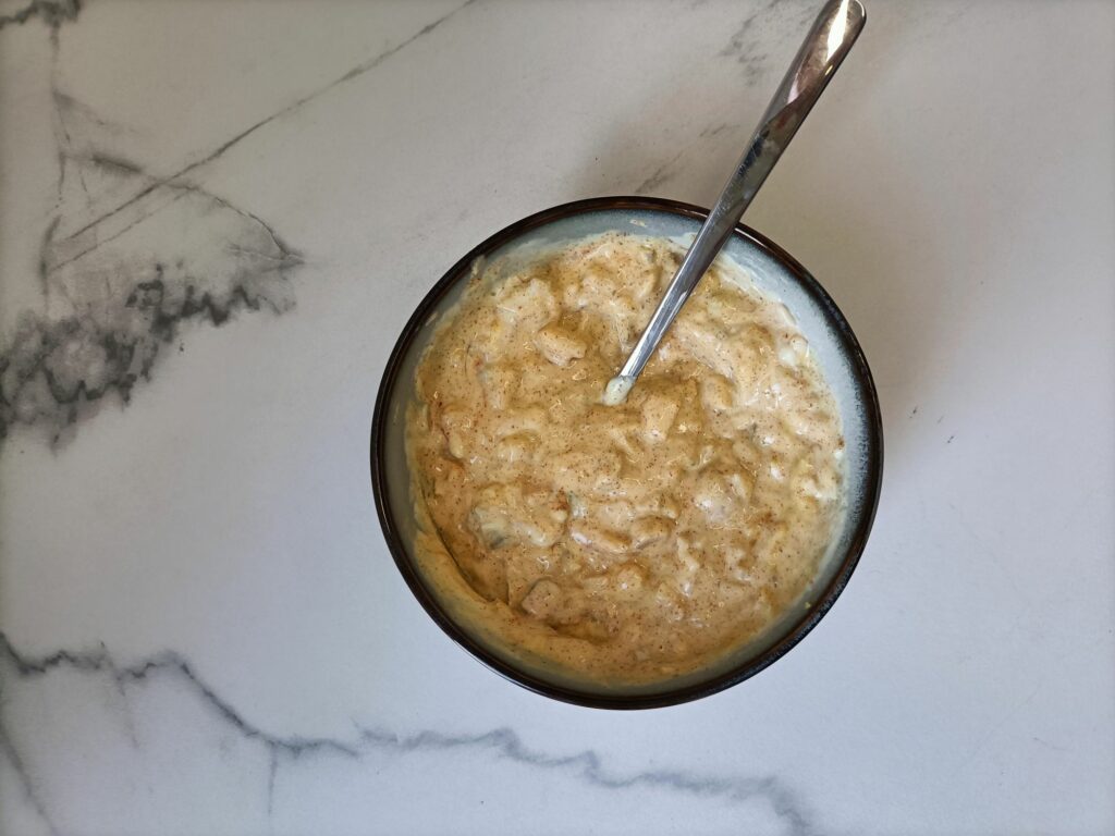 Laat de saus minstens 30 minuten in de koelkast staan om de smaken goed te laten mengen.