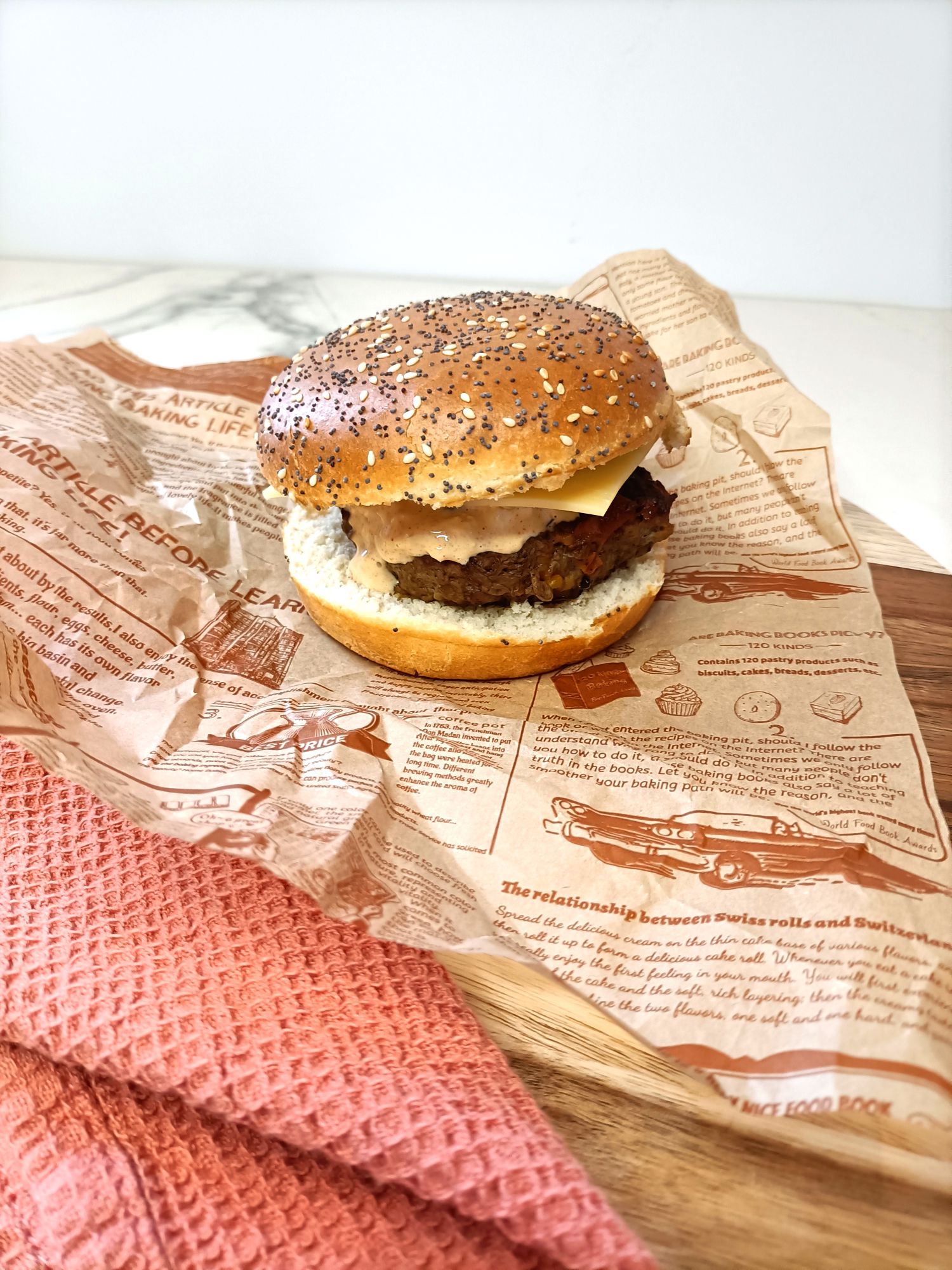 Bak de hamburger broodjes af volgens de verpakking. Verdeel de hamburgers over de broodjes. Maak de hamburger broodjes af met de saus en een topping naar keuze.