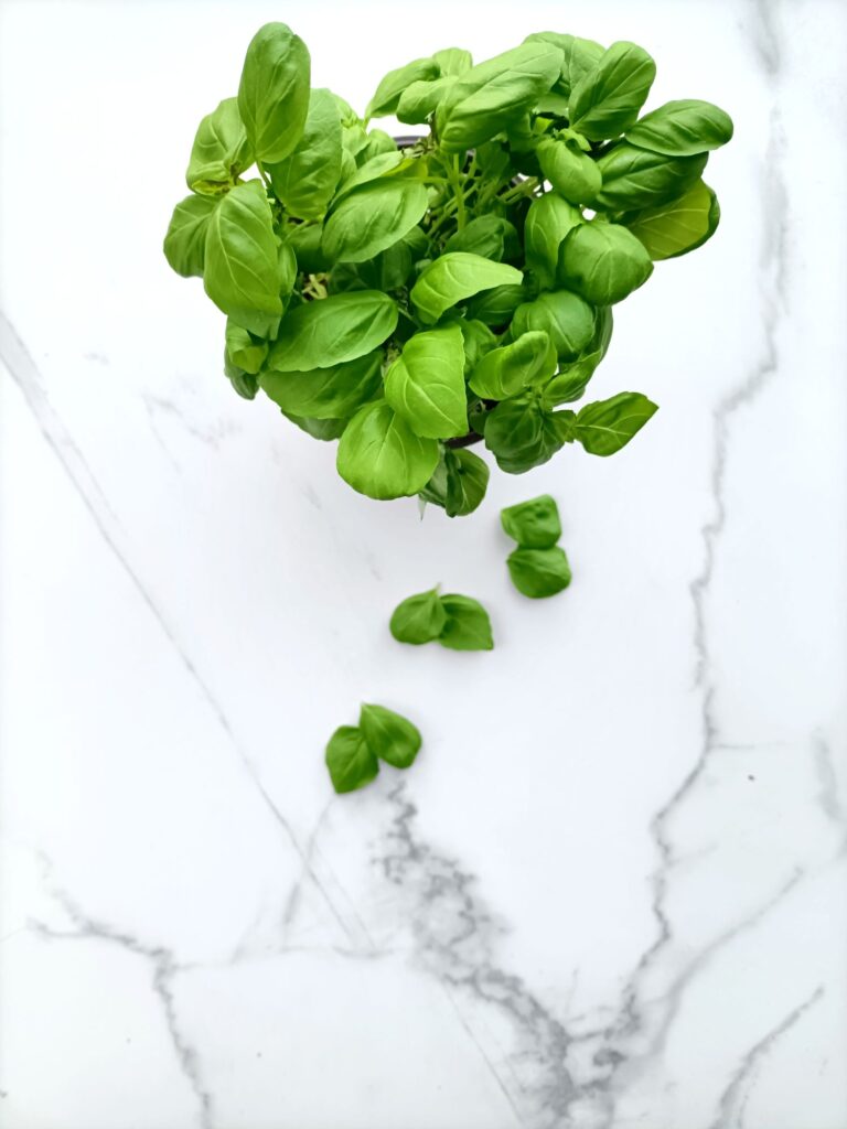 Pluk een paar verse blaadjes basilicum.