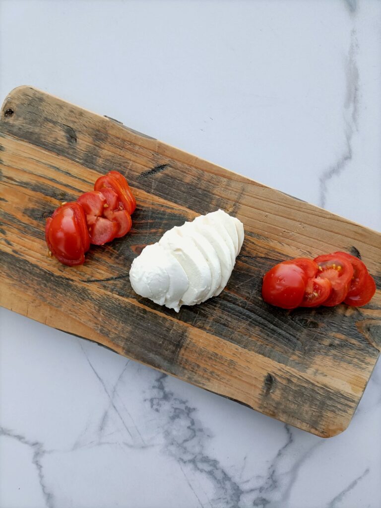 Snijd de tomaat en mozzarella in dunne plakjes.