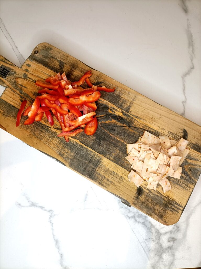Snij de paprika in kleine reepjes. Snij de plakjes kipfilet in kleine stukjes.