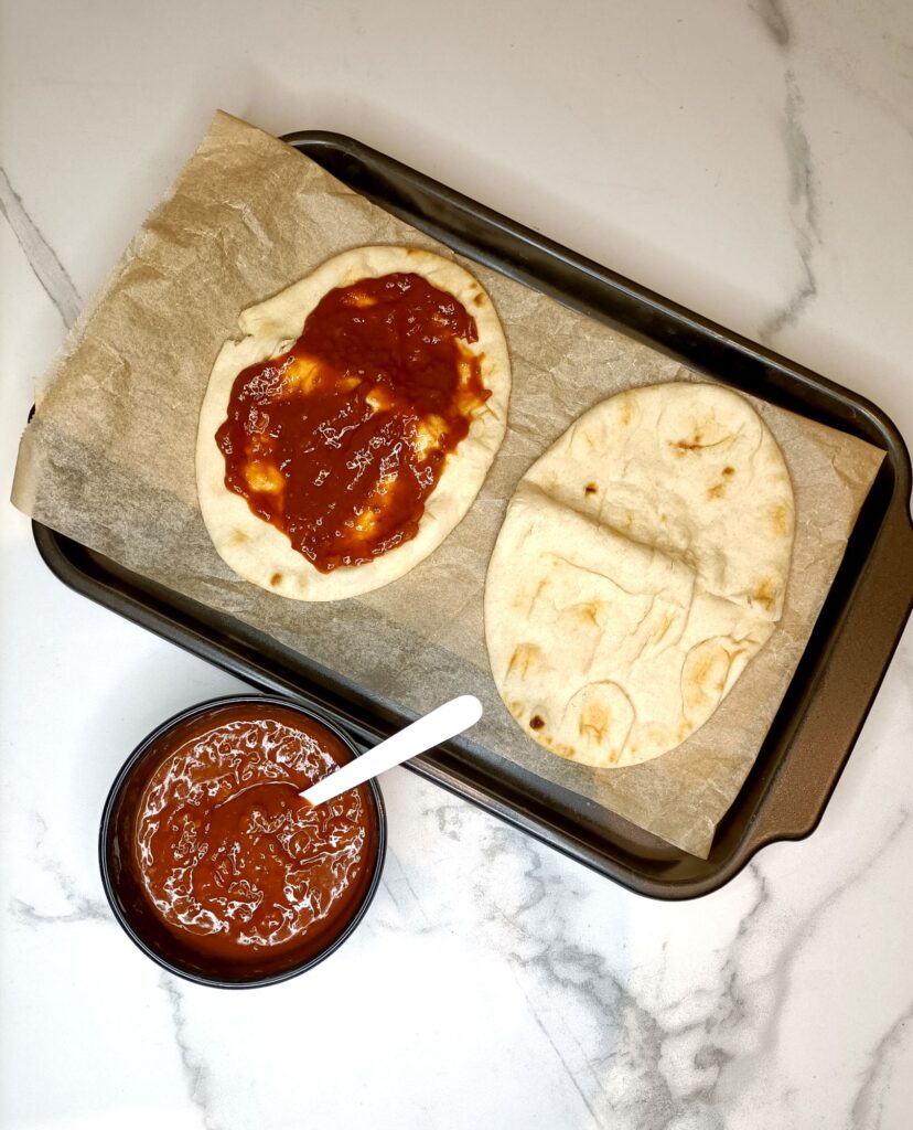 Leg de flatbreads op de bakplaat. Smeer elk flatbread in met een eetlepel pastasaus.