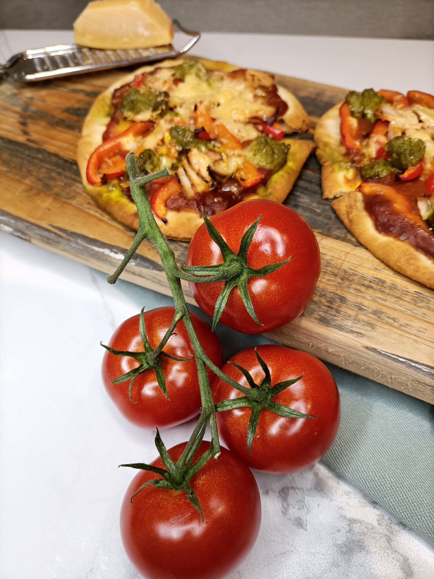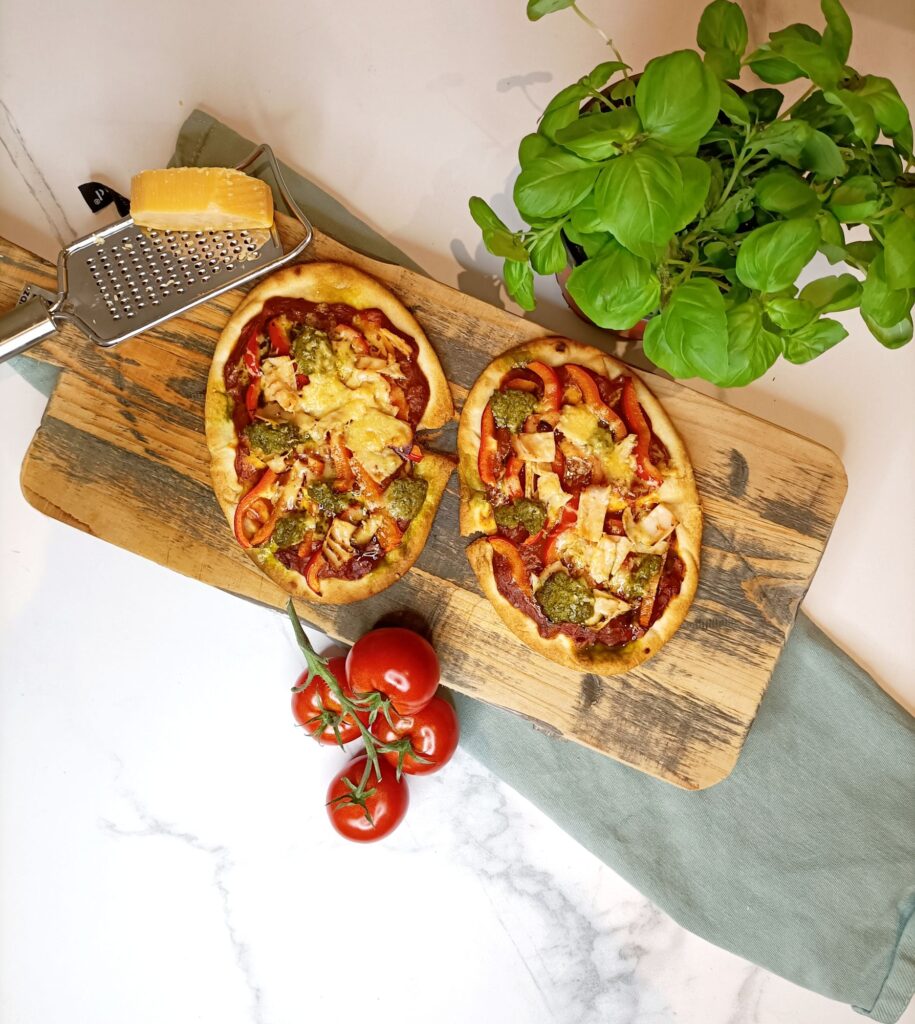 Verdeel de paprikareepjes en kipfilet gelijkmatig over de flatbreads. Verdeel per flatbread 1 theelepel pesto. Strooi daarna een handje geraspte kaas eroverheen.