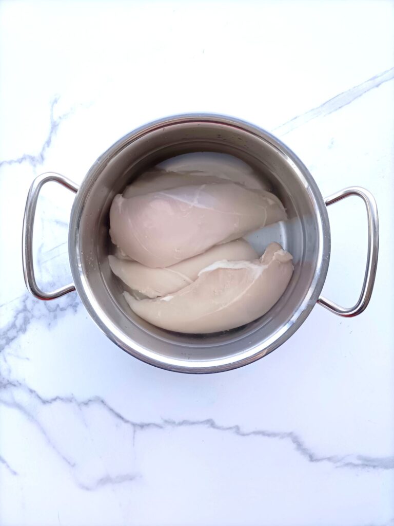 Breng een pan water met bouillonblokjes aan de kook en kook de kipfilets 20 minuten tot ze gaar zijn. Hou 250 ml bouillon apart.Laat iets afkoelen en trek de kip met twee vorken uit elkaar tot dunne reepjes.