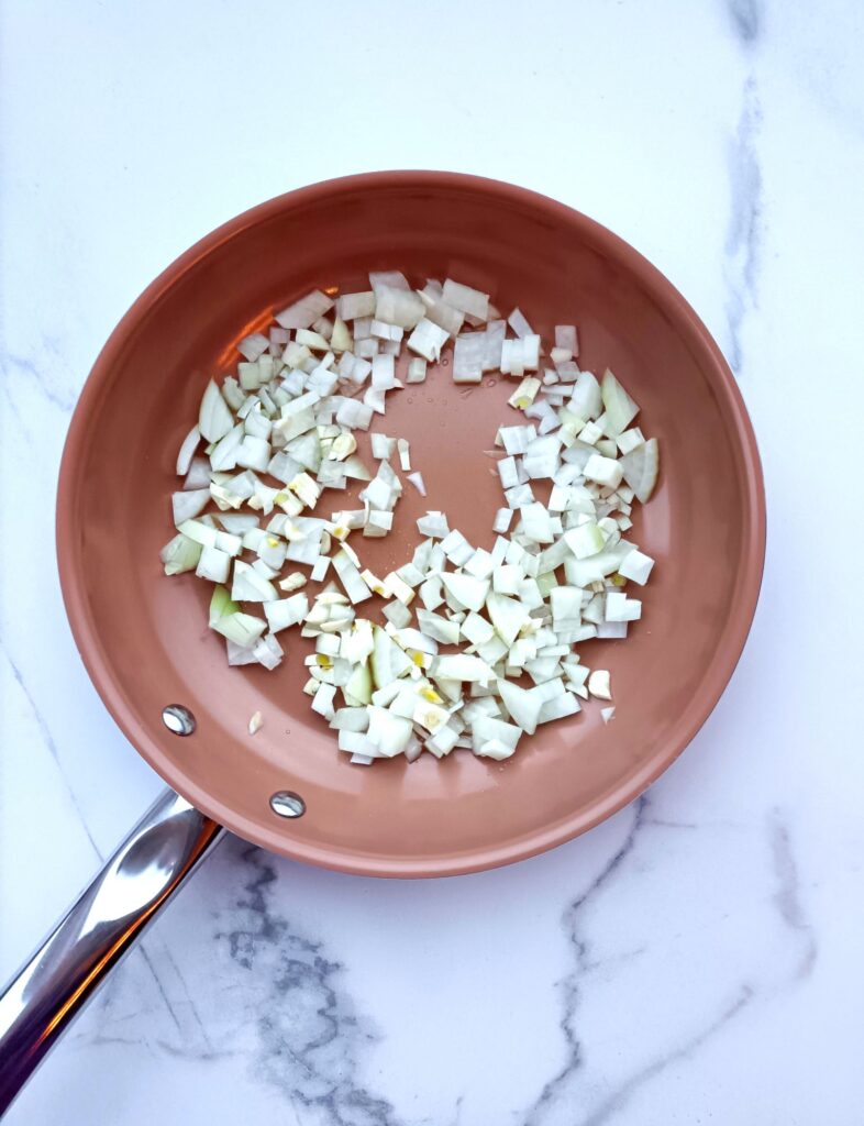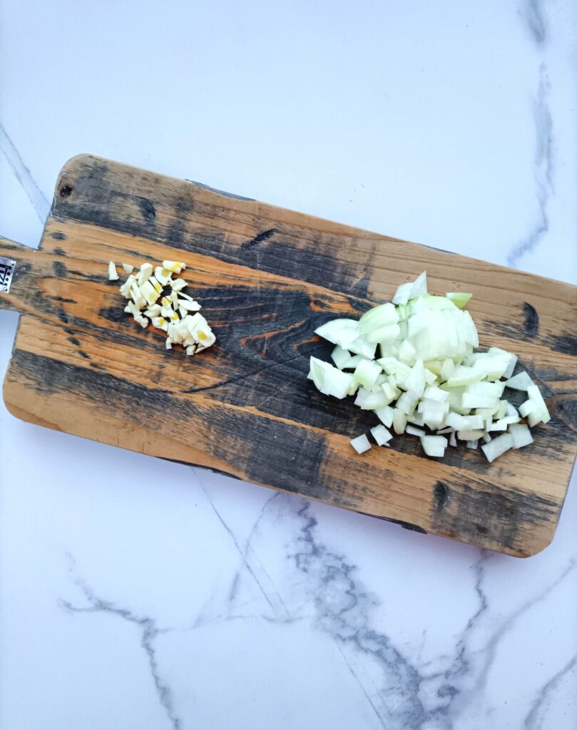 Snipper de ui en hak de teentjes knoflook fijn.