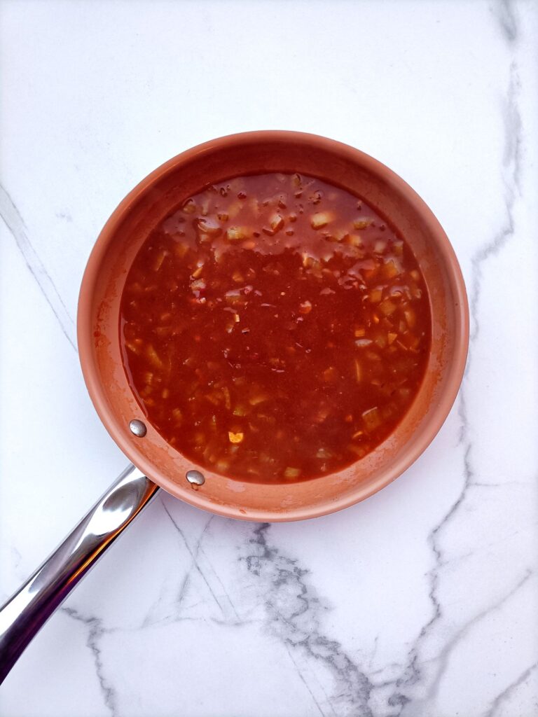 Voeg de gerookte paprikapoeder, komijnpoeder, barbecuesaus en 250 ml kippenbouillon toe aan de pan. Laat de saus 10 minuten pruttelen.