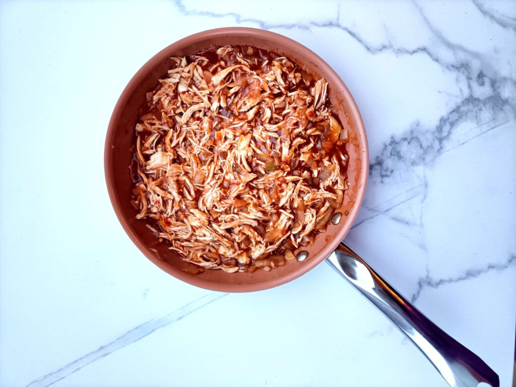 Doe de uit elkaar getrokken kip in de pan met saus. Roer goed zodat alle kip bedekt is met de saus. Laat de kip 10 minuten sudderen zodat de smaken goed intrekken.